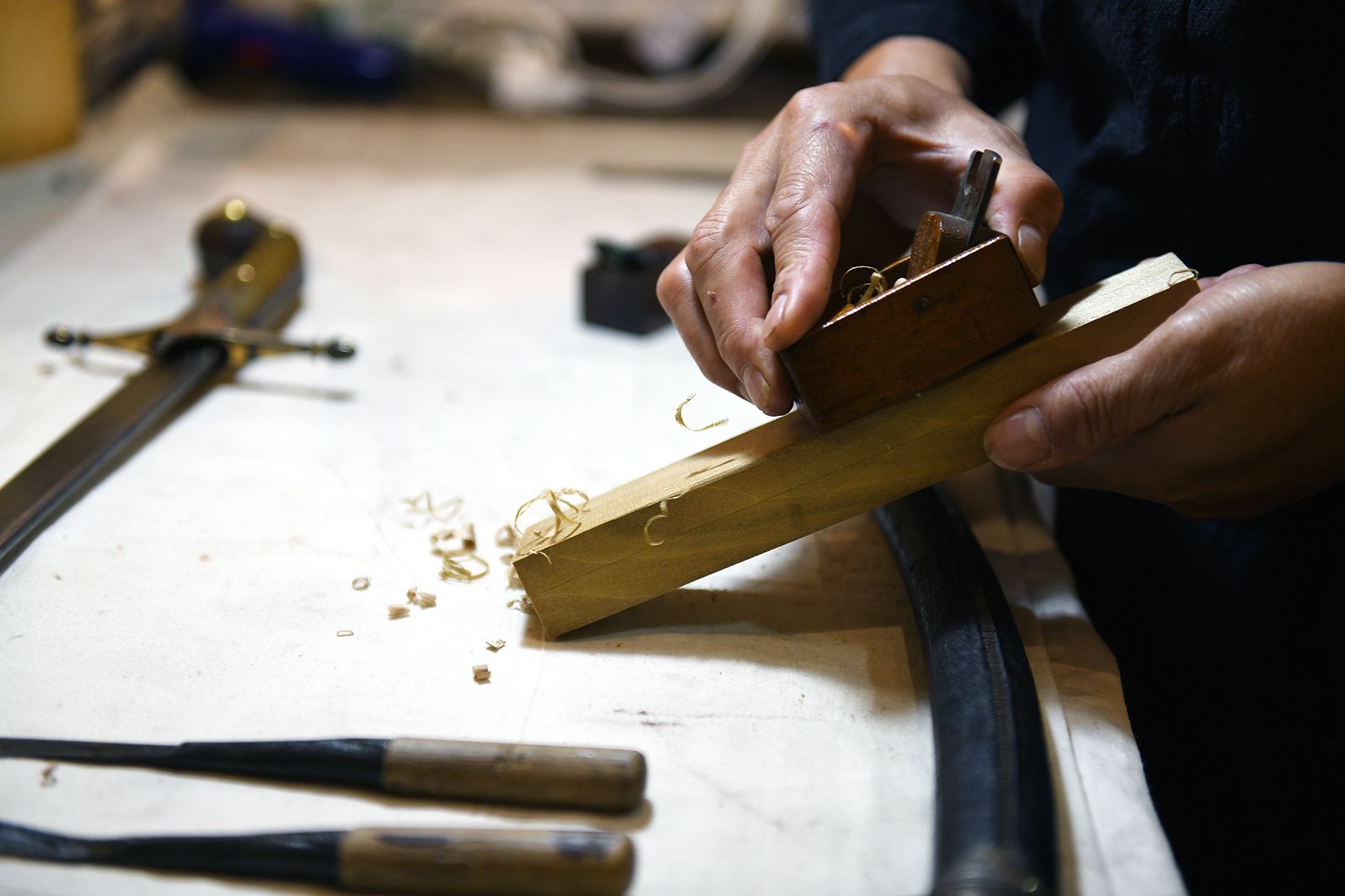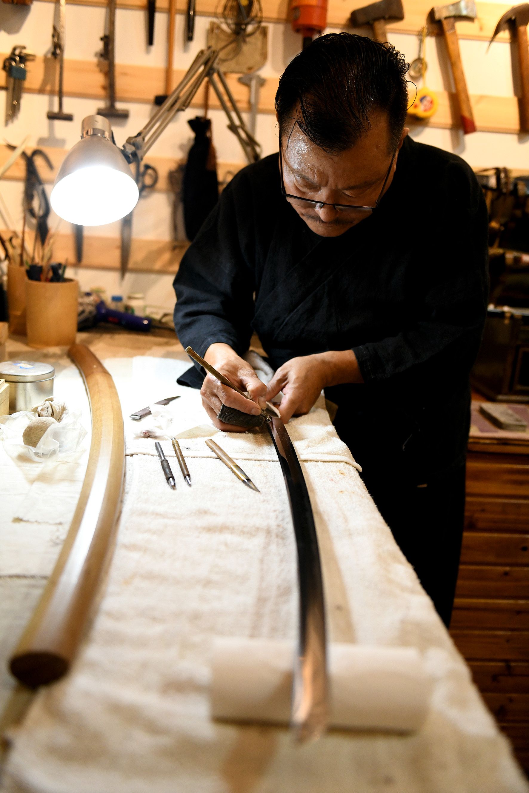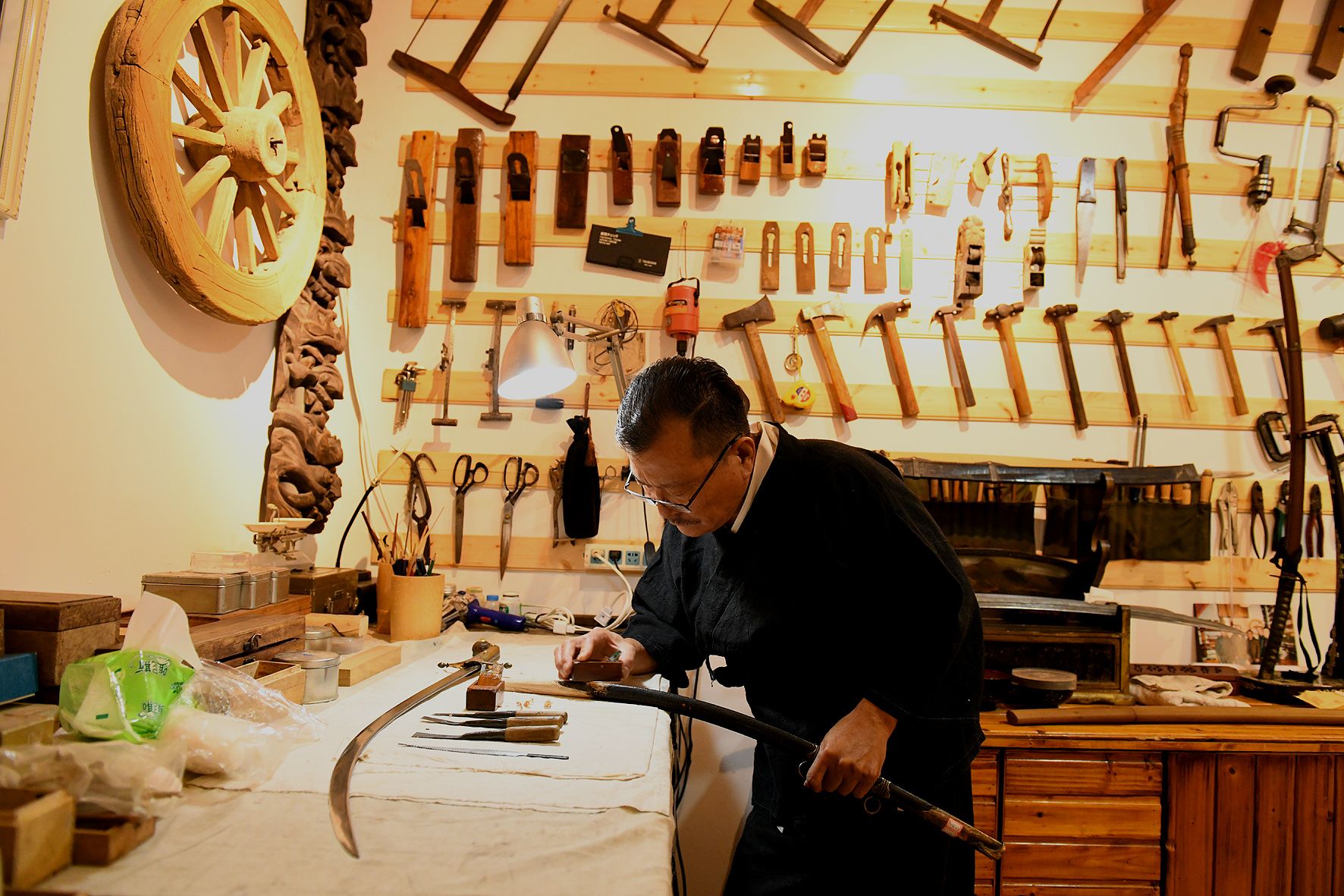9月11日,在石家庄市新华区古兵器修复工作室内,闫民在展示修复好的古兵器。 石家庄市民闫民自幼酷爱兵刃刀剑,他已从事古兵器修复工作30余年。其子闫鹏受其影响,于2015年辞去原有工作,与父亲一起投入到古兵器修复中。如今父子两人累计修复古兵器500余件。 据闫民介绍,古兵器修复大体分为装具修复和刃体修复。在断定年代后,通过装具修复为古兵器配备相应年代的装饰和装具,再通过打磨、压光、研磨等工序对古兵器刃体进行修复。 闫民说,每一件古兵器都代表一段历史,修复古兵器也是再现历史,今后他们将与时间赛跑,为中国古兵器文化尽绵薄之力。新华社发(陈其保 摄)