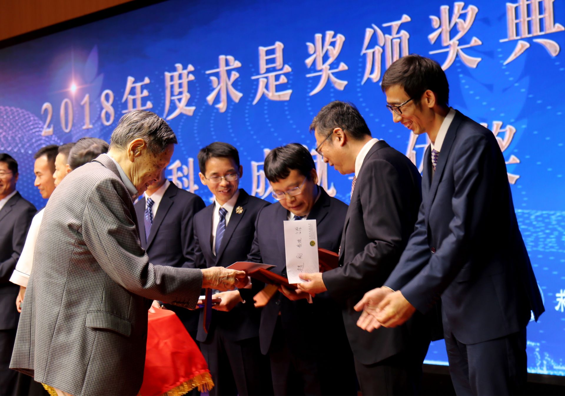 9月15日,江雷(中)获2018年度“求是杰出科学家奖”。 9月15日晚,由香港求是科技基金会主办、中国科学技术大学承办的2018年度“求是奖”在安徽合肥揭晓,中科院院士、中科院理化技术研究所研究员江雷获得“求是杰出科学家奖”。求是基金会主席查懋声,顾问杨振宁、孙家栋、韩启德、施一公等出席颁奖典礼。新华社记者 邬金夫 摄