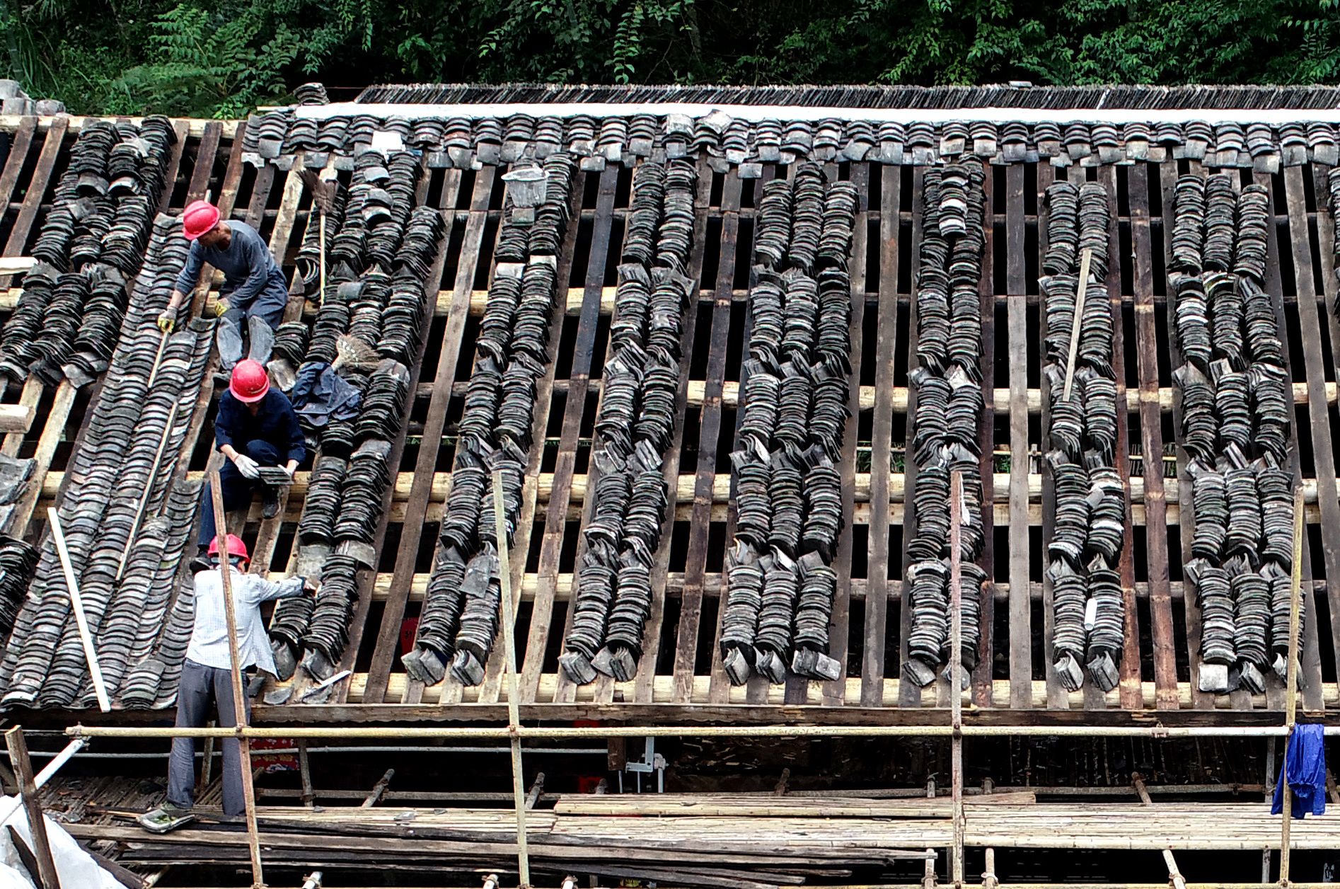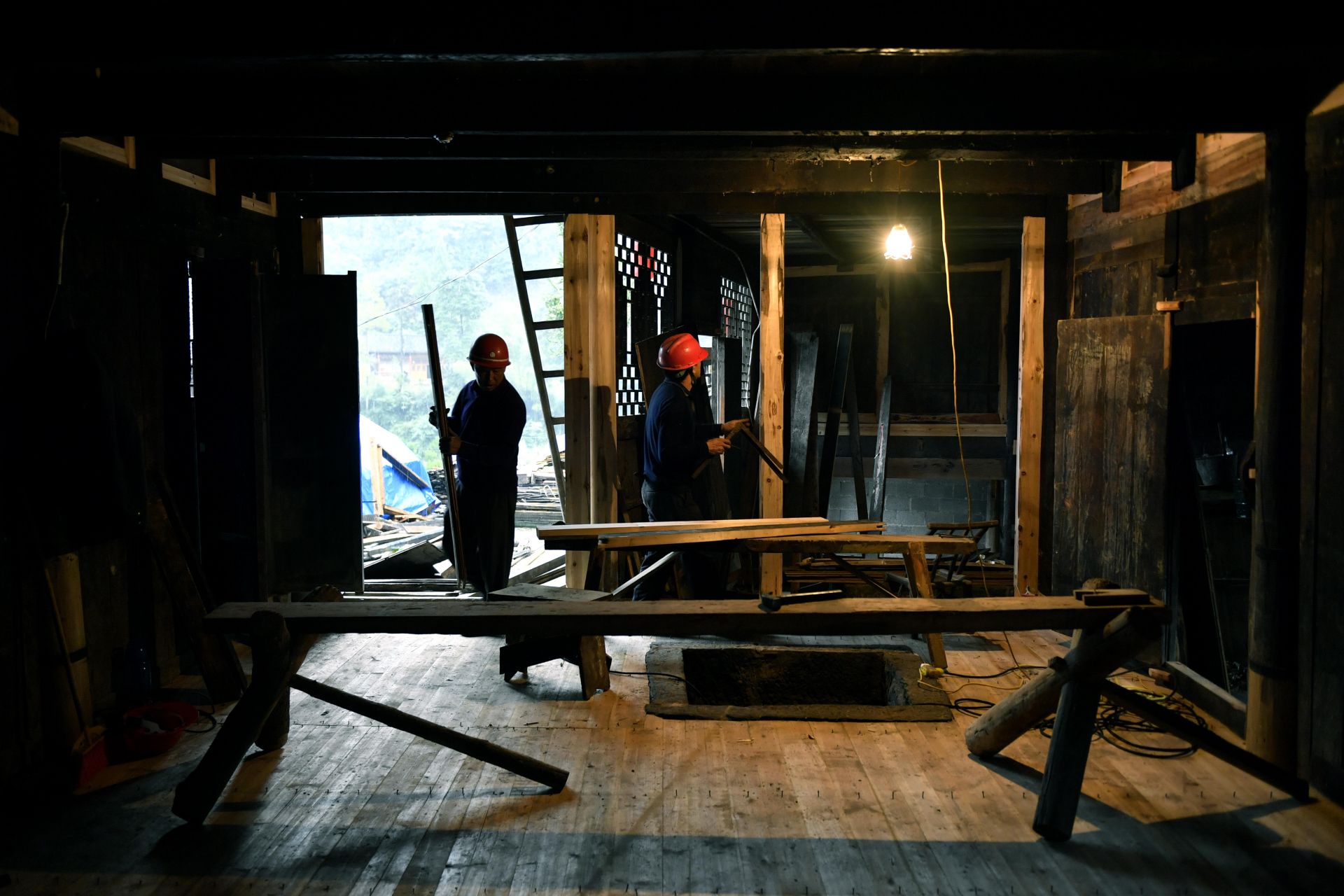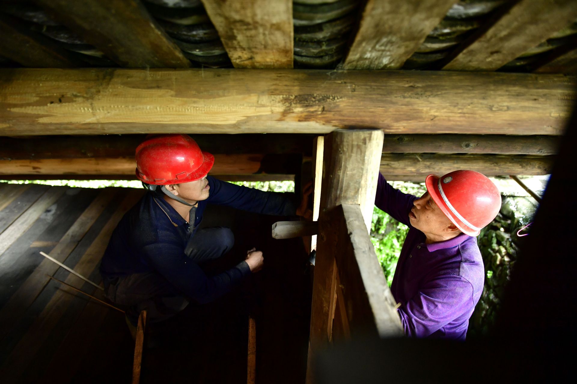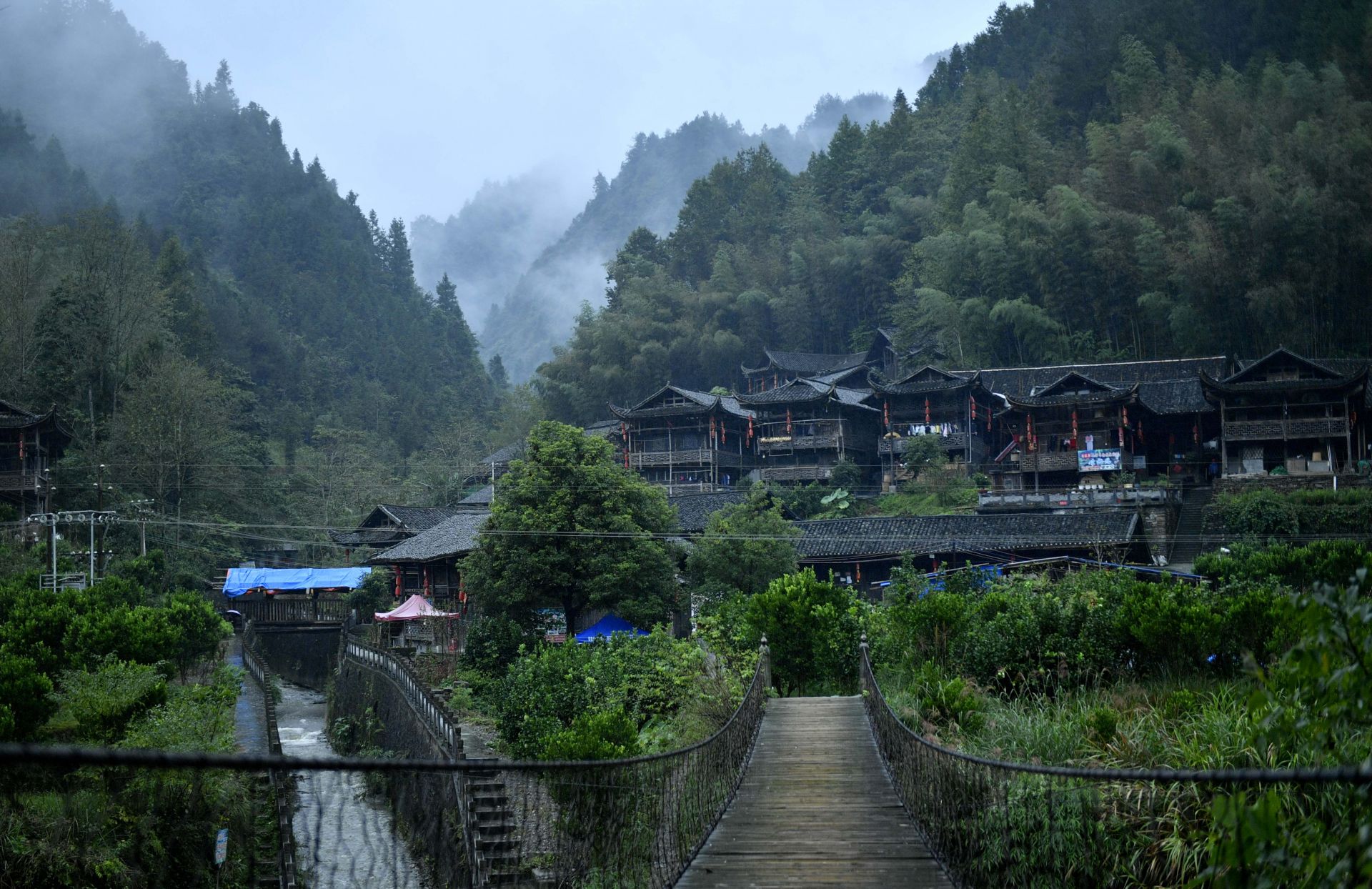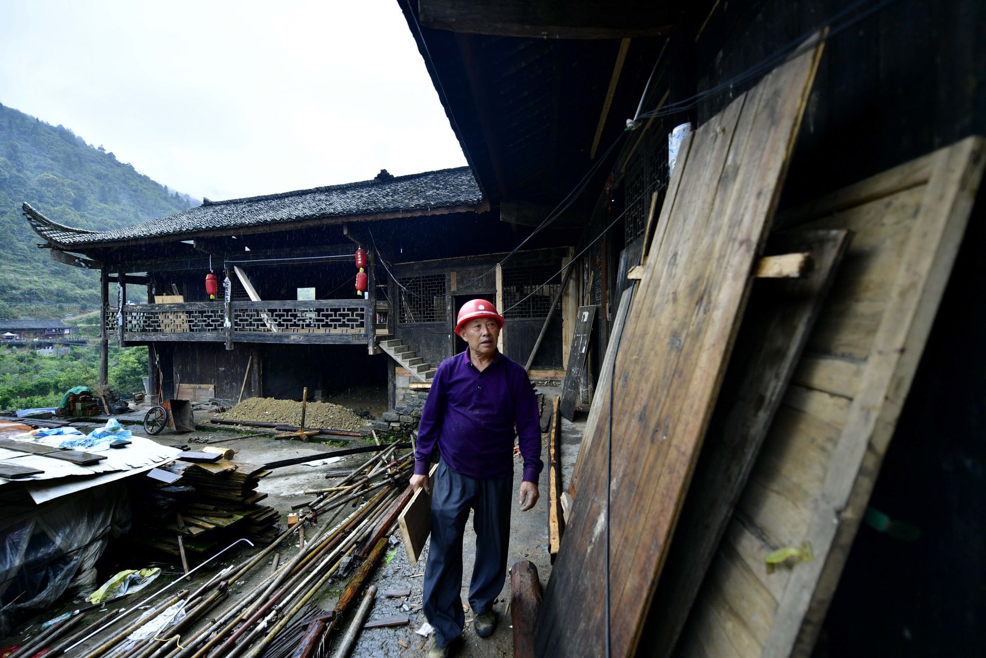 这是9月25日拍摄的彭家寨古吊脚楼群。古寨前的吊桥是村民进出的主要通道。 今年以来,湖北省恩施土家族苗族自治州宣恩县组织精通吊脚楼修建技艺的木匠师傅,按照“整旧如旧”的原则,用传统手工艺对拥有近300年历史的彭家寨古吊脚楼群进行全面修缮。 彭家寨坐落在湖北省西部武陵山麓,位于恩施土家族苗族自治州宣恩县沙道沟镇,被列入全国第七批重点文物保护单位。新华社发(宋文 摄)