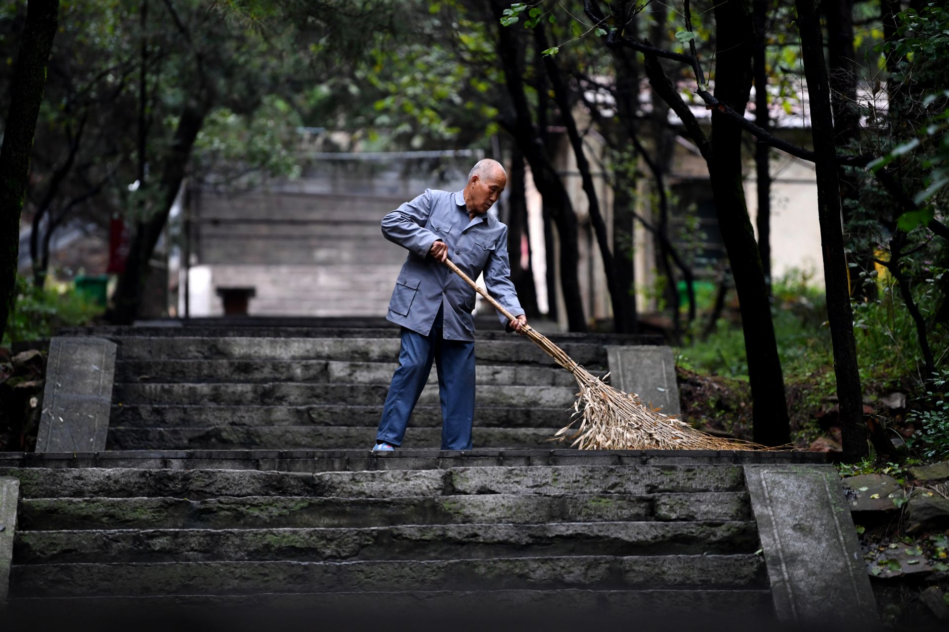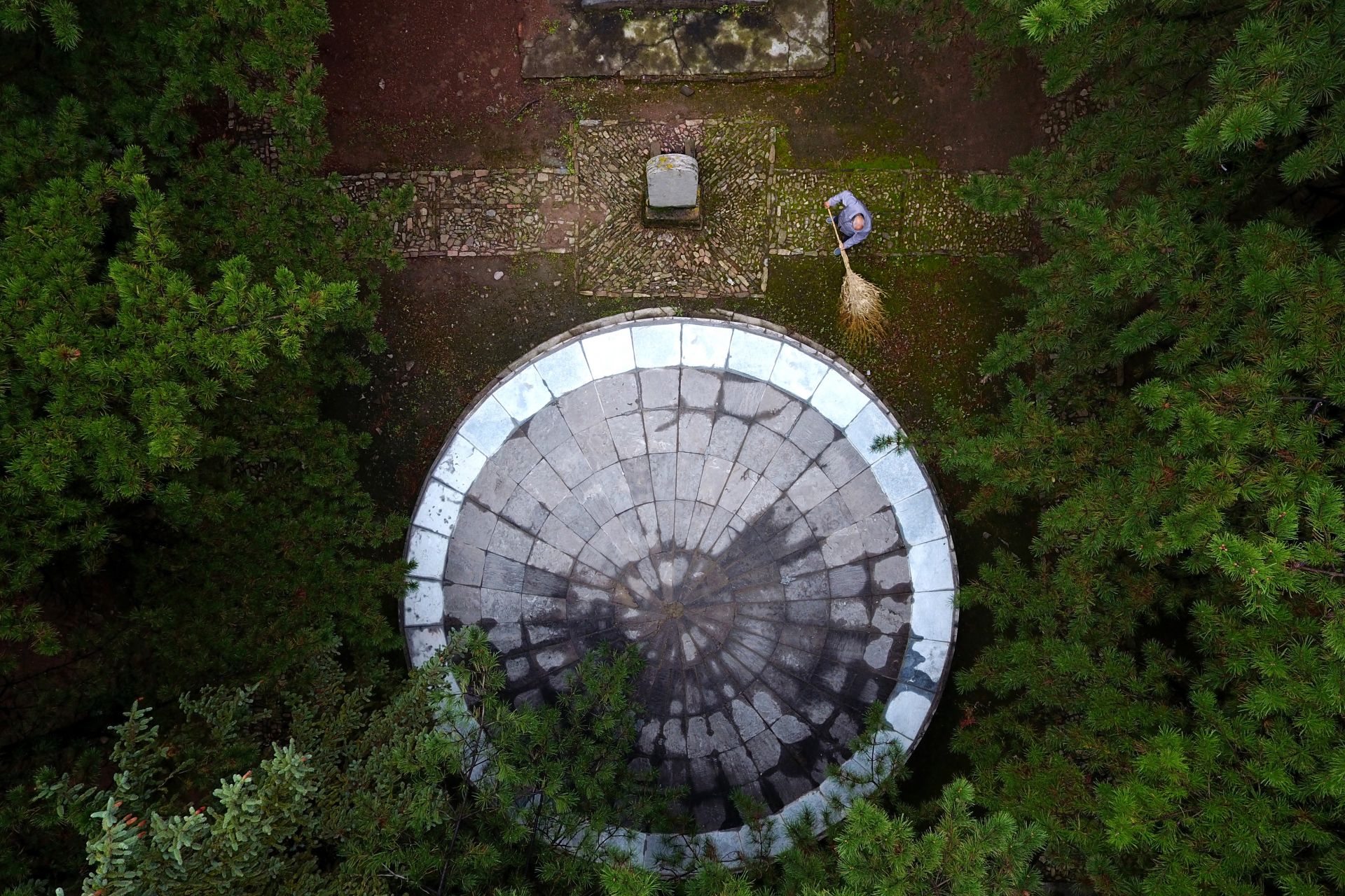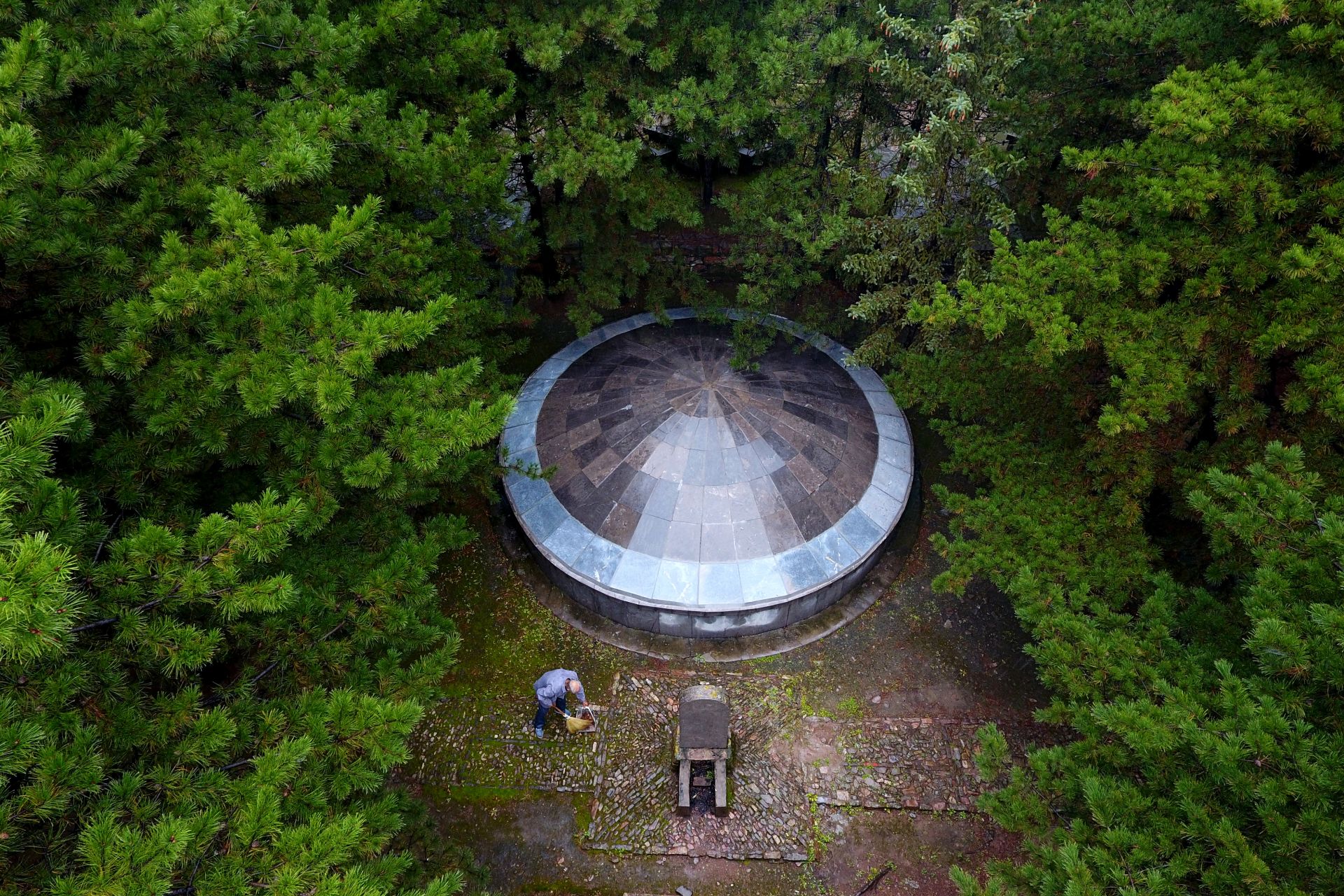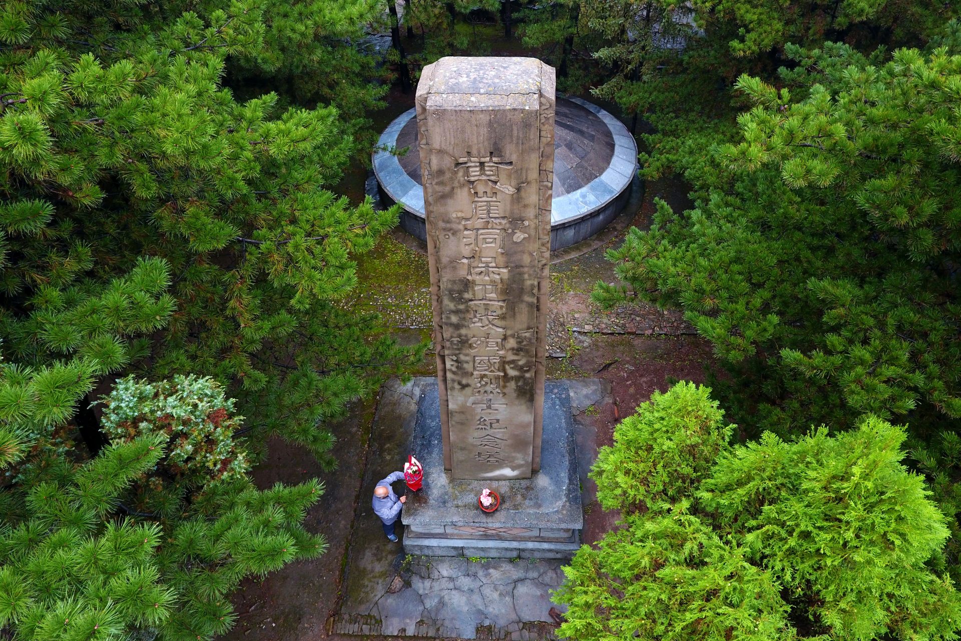 在黄崖洞烈士陵园,赵乃堂在清扫落叶(9月20日无人机拍摄)。 巍巍太行山上,庄严的黄崖洞烈士陵园里,44位烈士长眠于此。 一位老人,一间老屋,27个春秋,山西省长治市黎城县岩头岭村73岁的赵乃堂默默守护着神圣的烈士墓。 身为土生土长的黎城人,赵乃堂从小就知道黄崖洞兵工厂和黄崖洞保卫战的战斗故事。抗日战争年代,黄崖洞兵工厂是八路军根据地创建最早、规模最大的兵工基地。著名的黄崖洞保卫战就发生在这里。黄崖洞保卫战时,赵乃堂的父亲为八路军运送粮食、打扫战场,目睹了八路军战士的英勇无畏。赵乃堂从小就听父亲讲黄崖洞的故事,深知现在幸福生活的来之不易,是先烈用鲜血与生命换来的。 长大后,赵乃堂参加训练成为民兵,由于表现突出,还担任了村里的民兵连长。后来,赵乃堂在林场、铁厂工作时,经常上山到烈士墓前祭拜,看到当年的兵工厂遗址和烈士墓,赵乃堂决心为英雄们做些什么。1991年,赵乃堂来到黄崖洞烈士陵园,守护英灵。这一守,就是27年。新华社记者 詹彦 摄