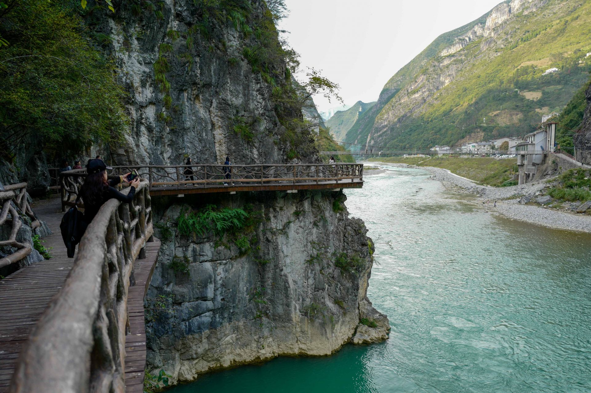 巫溪县大宁河的沿河栈道上,一名游客在拍摄美景(10月3日摄)。 国庆长假期间,位于重庆市巫溪县大山深处的宁厂古镇和沿河栈道,以秘境般的神秘气质和秀丽的自然风光,吸引了不少游客前往旅游探秘。新华社记者 刘潺 摄