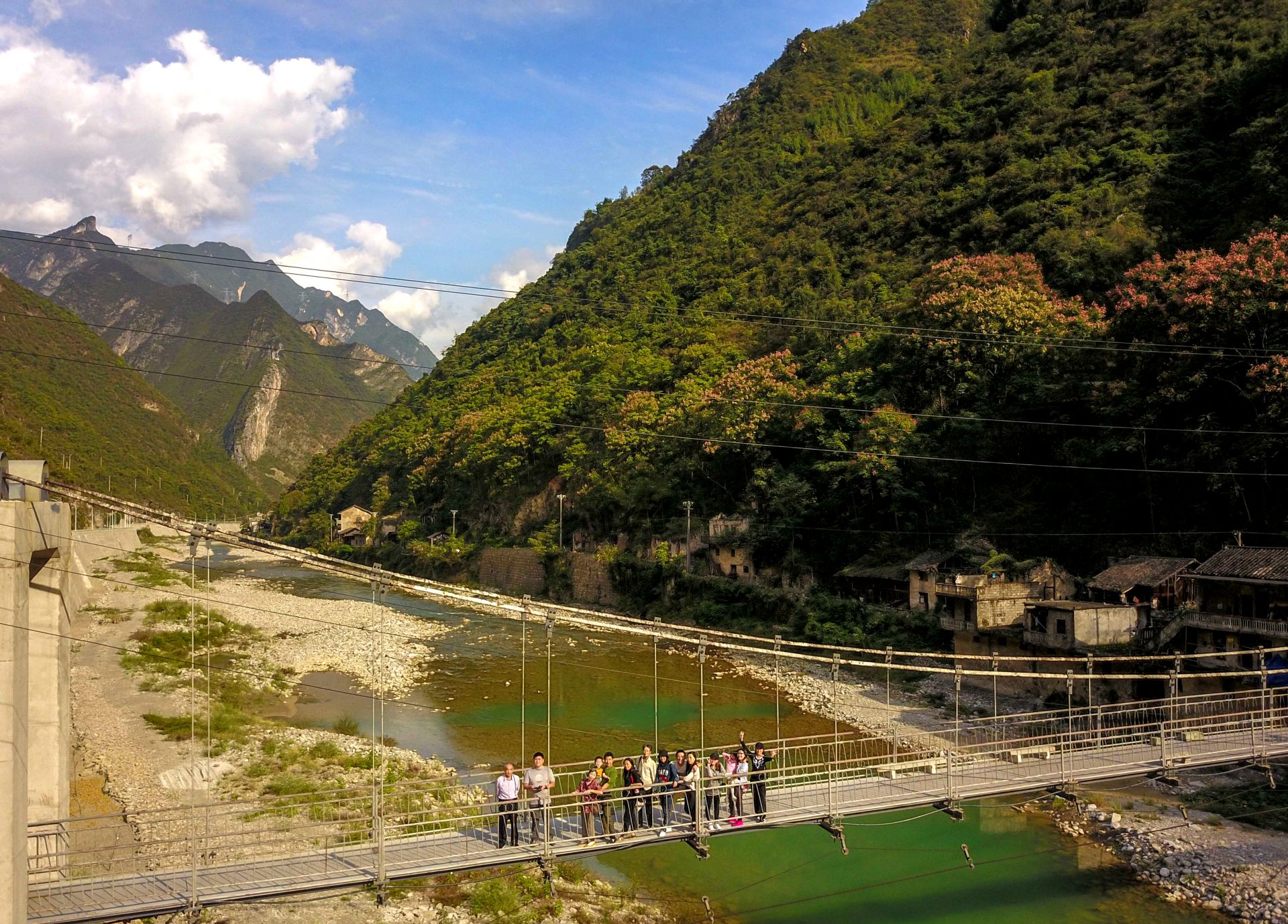 游客在巫溪县宁厂古镇的索桥上欣赏美景(10月3日无人机拍摄)。新华社记者 刘潺 摄
