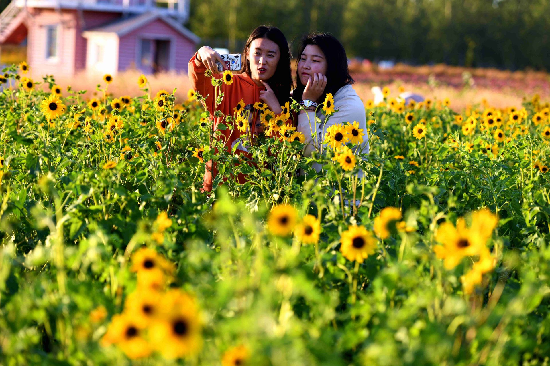 10月9日,在河北省石家庄市滹沱河畔的森林河趣那公园内,游客在花田观赏游览。 金秋十月,秋花竞相开放,色彩斑斓,争奇斗艳。新华社发(陈其保 摄)