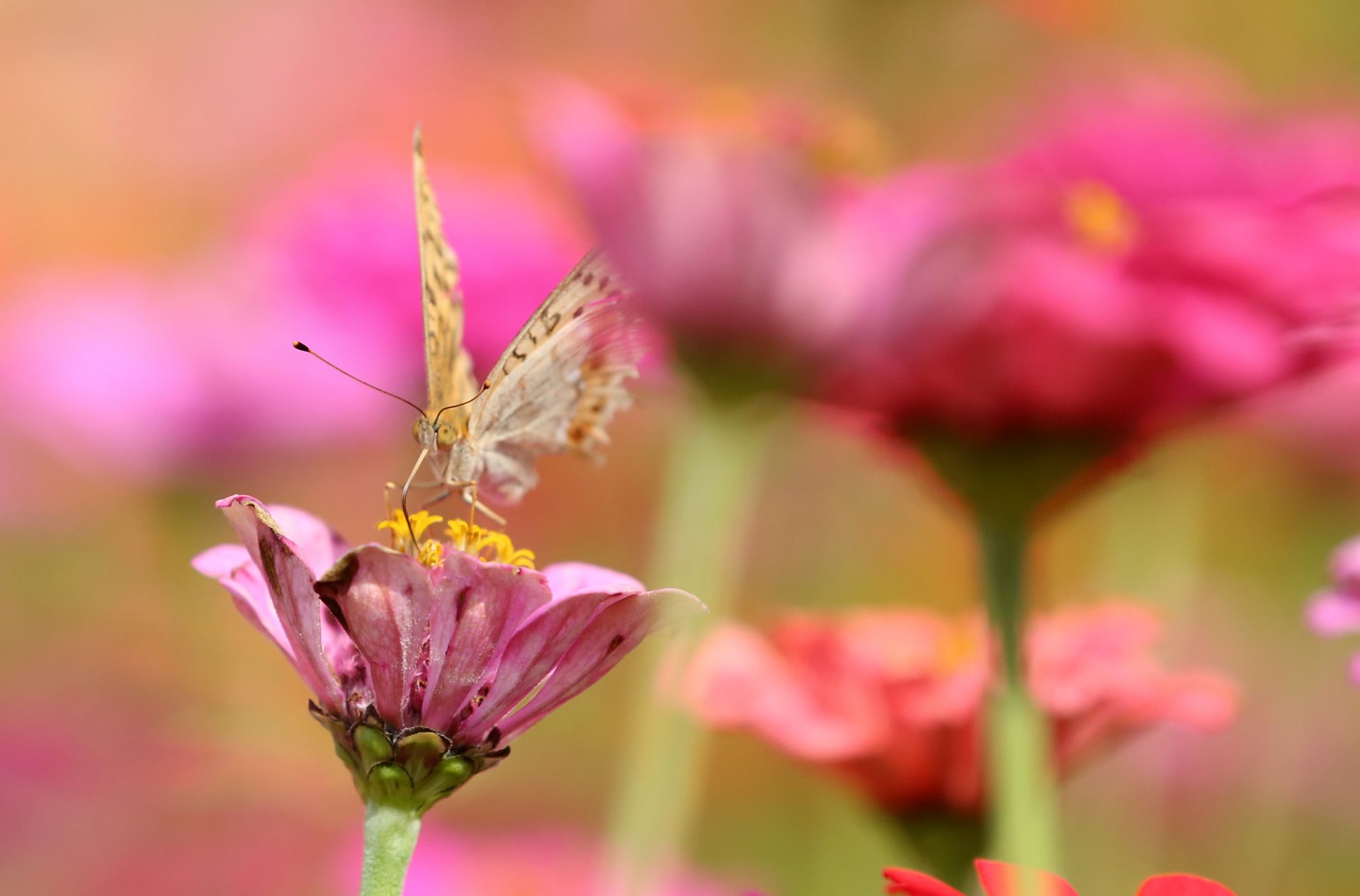 10月9日,在福建省泉州市德化县桂阳乡一家生态园,百日菊竞相开放,引得蝴蝶蹁跹而至。新华社发(张九强 摄)