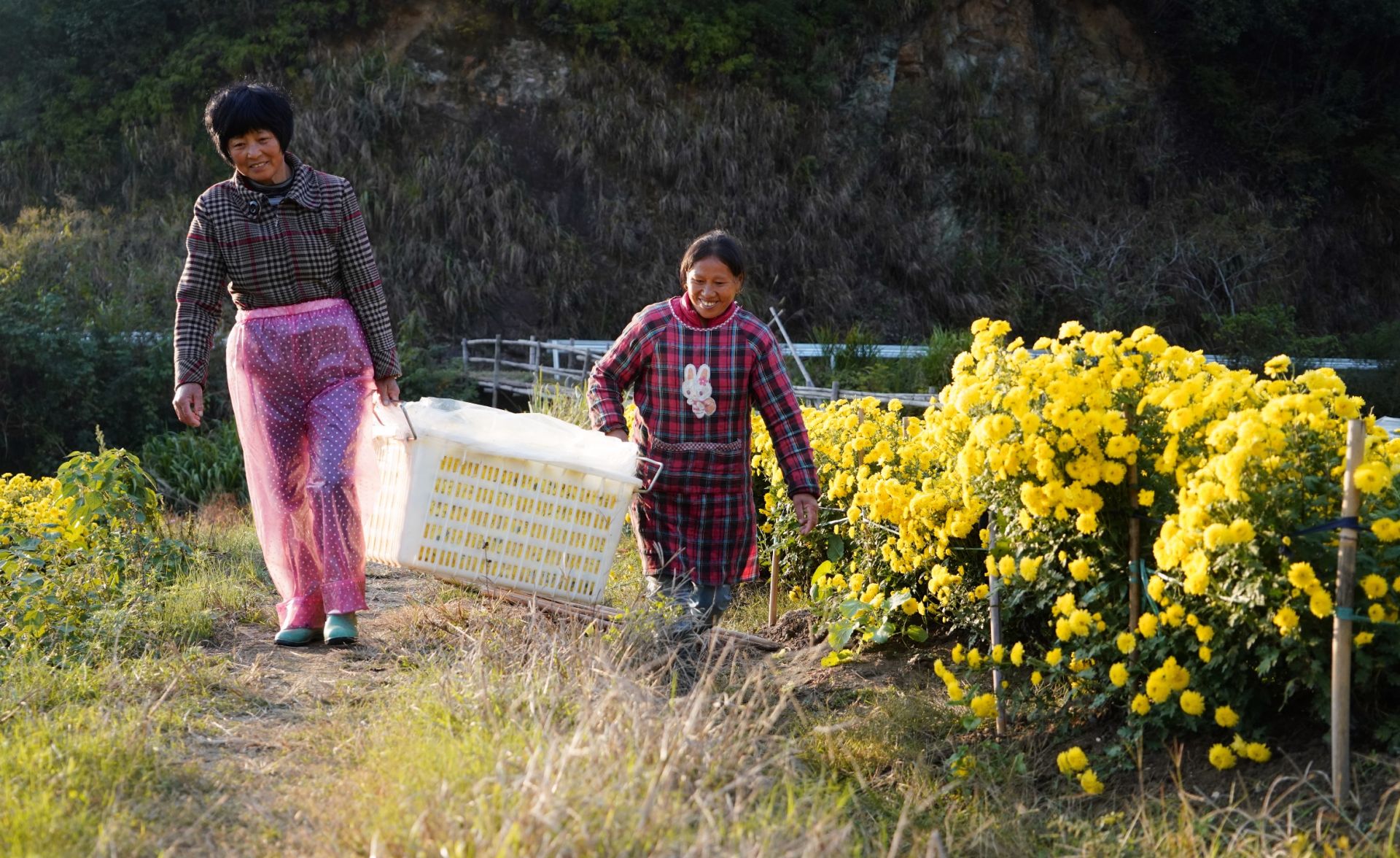 11月8日,婺源县思口镇农户在运送采摘的皇菊。新华社记者 胡晨欢 摄