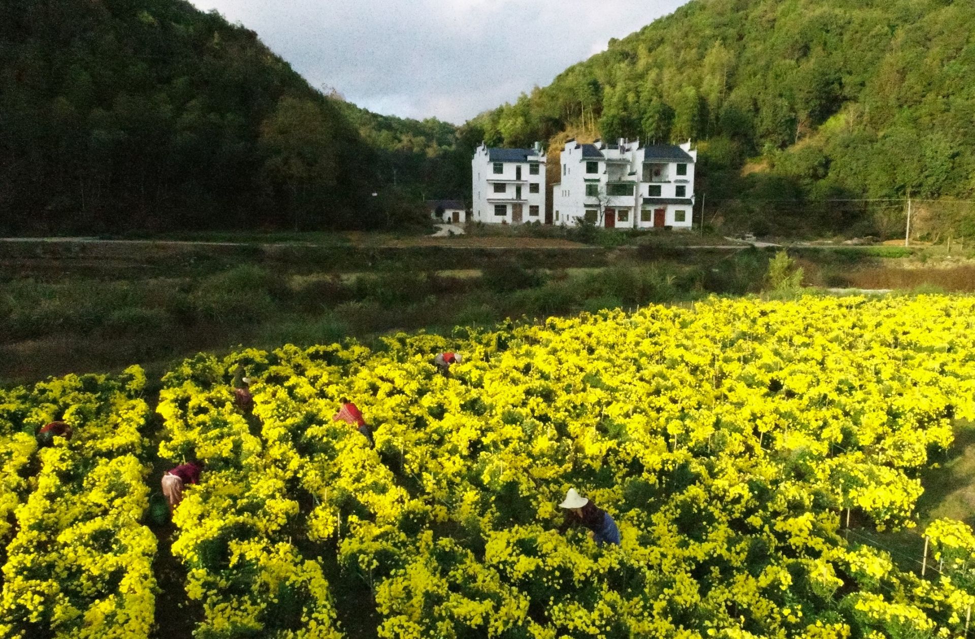 11月8日,婺源县思口镇农户在采摘皇菊(无人机拍摄)。新华社记者 胡晨欢 摄