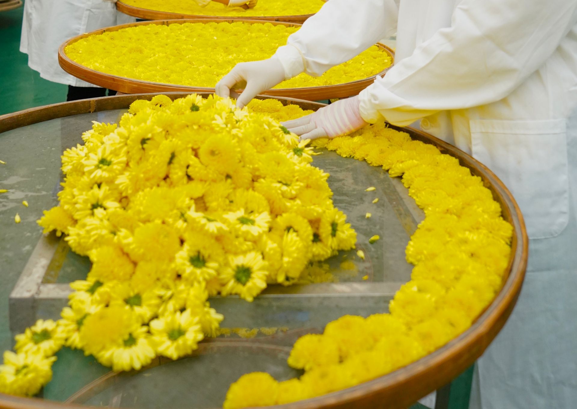 11月8日,婺源县一家皇菊加工厂的工作人员在筛选皇菊。新华社记者 胡晨欢 摄