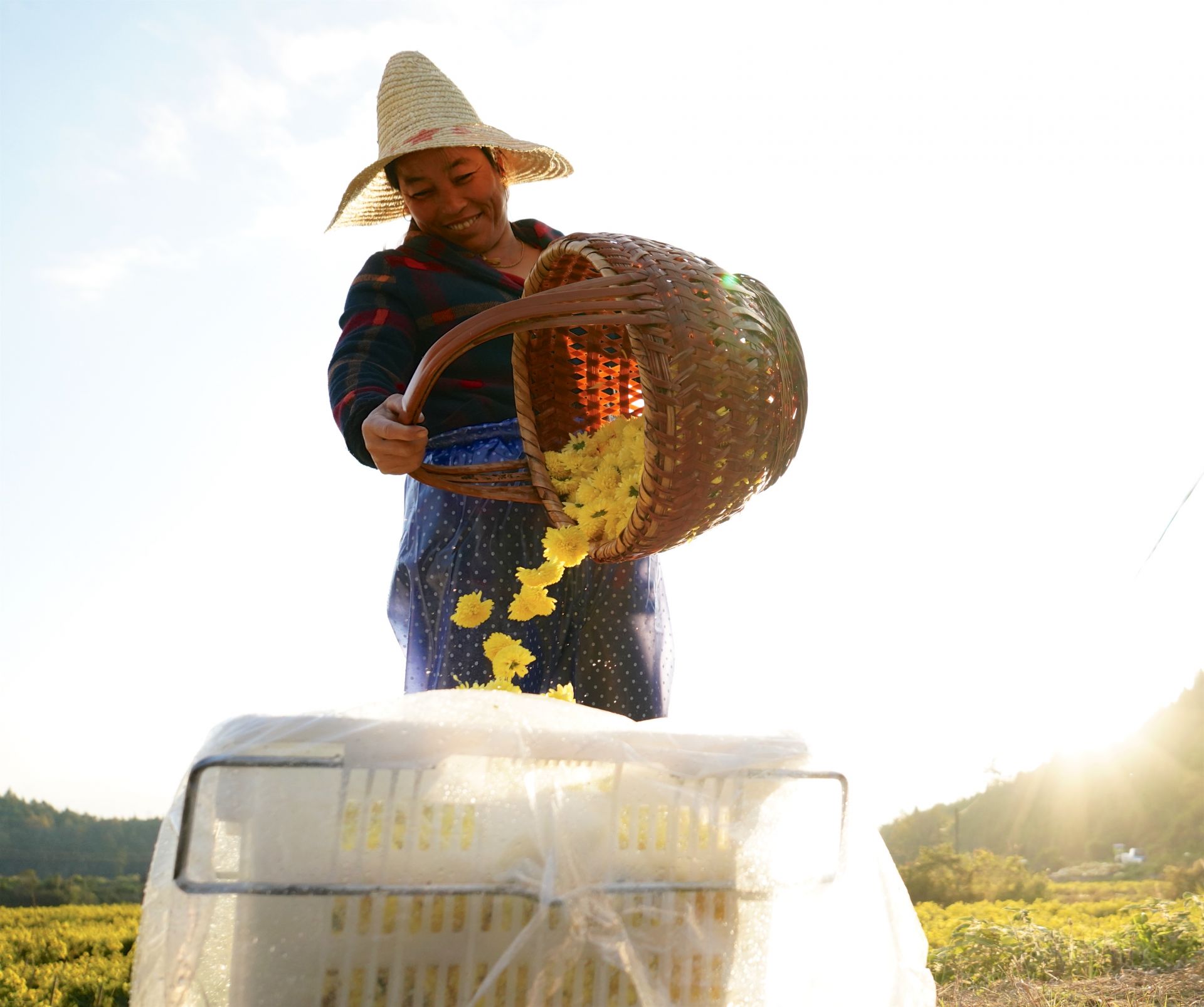 11月8日,婺源县思口镇农户将采摘好的皇菊收到筐中准备外运。新华社记者 胡晨欢 摄