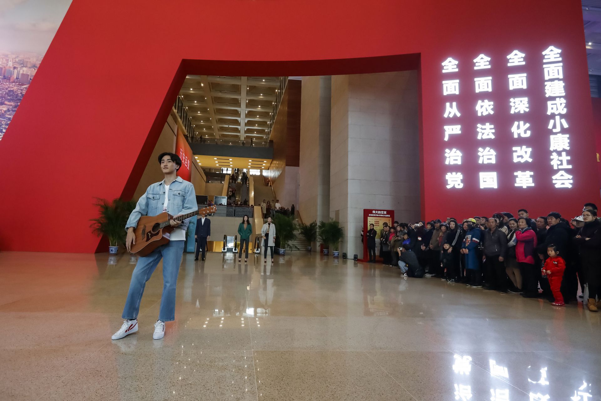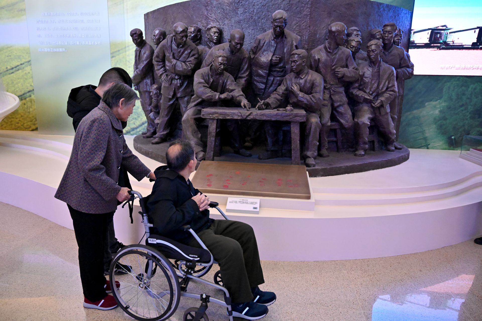 11月14日,观众在“伟大的变革——庆祝改革开放40周年大型展览”上观看安徽小岗村18位农民按下包产到户“红手印”的雕塑。新华社记者 李鑫 摄
