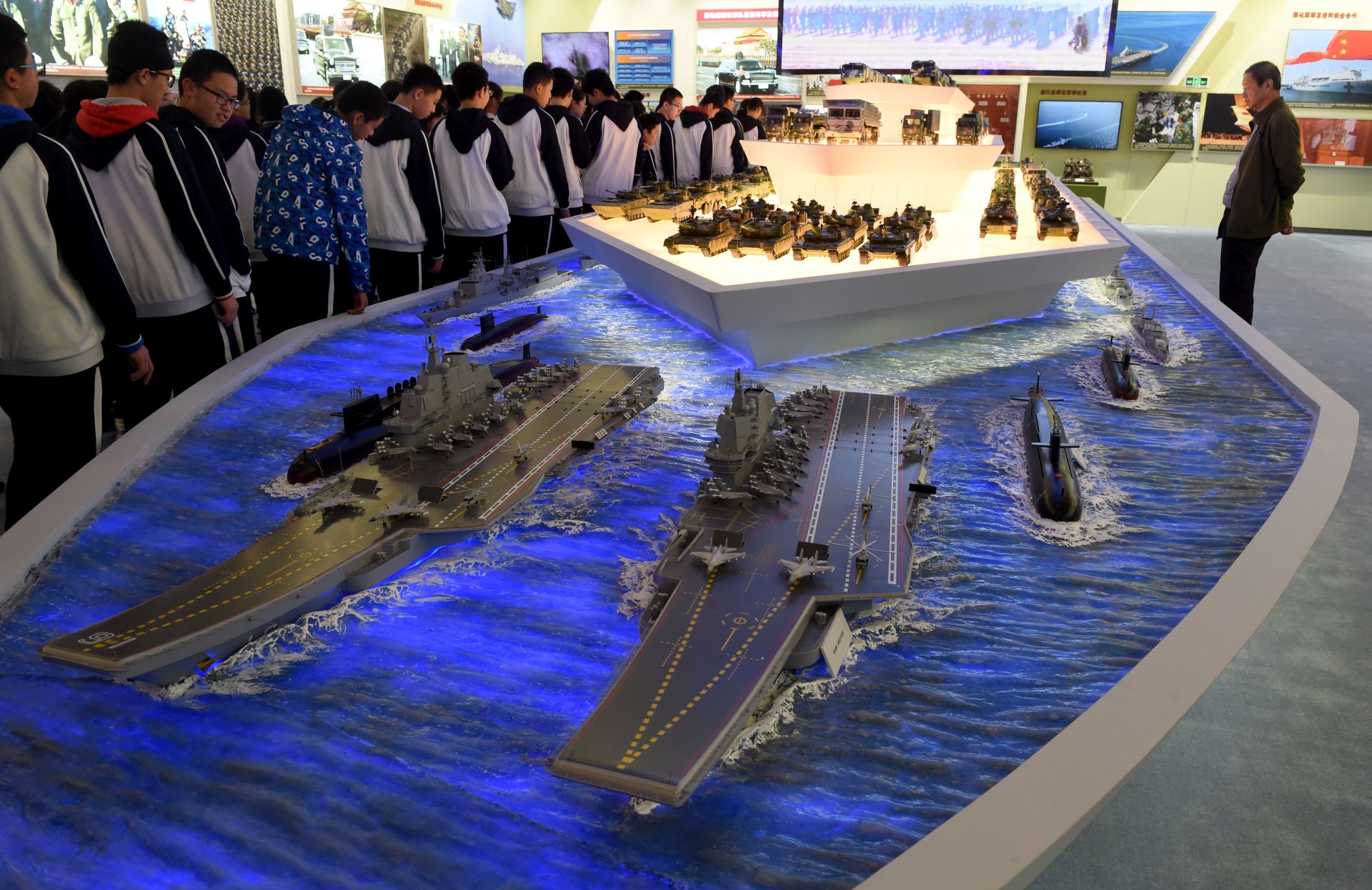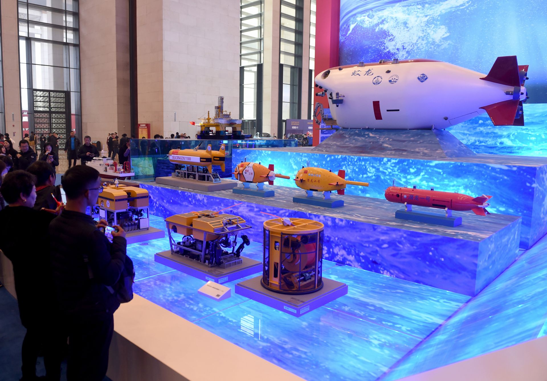 11月14日,观众在观看“蛟龙”号载人潜水器等模型。 为展现我国改革开放辉煌成就,特别是党的十八大以来党和国家事业所取得的历史性成就和历史性变革,经过半年多精心筹备,11月13日,“伟大的变革——庆祝改革开放40周年大型展览”在国家博物馆隆重开幕。 新华社记者 罗晓光 摄