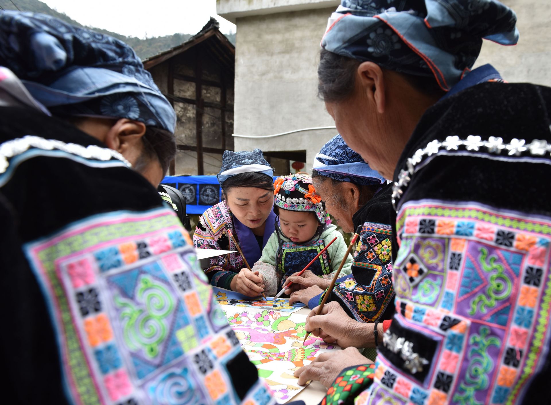 11月22日,在贵州省龙里县洗马镇平坡村苗画培训基地,兰群(左二)指导一名苗族小女孩体验绘制苗画。新华社发(龙毅 摄)