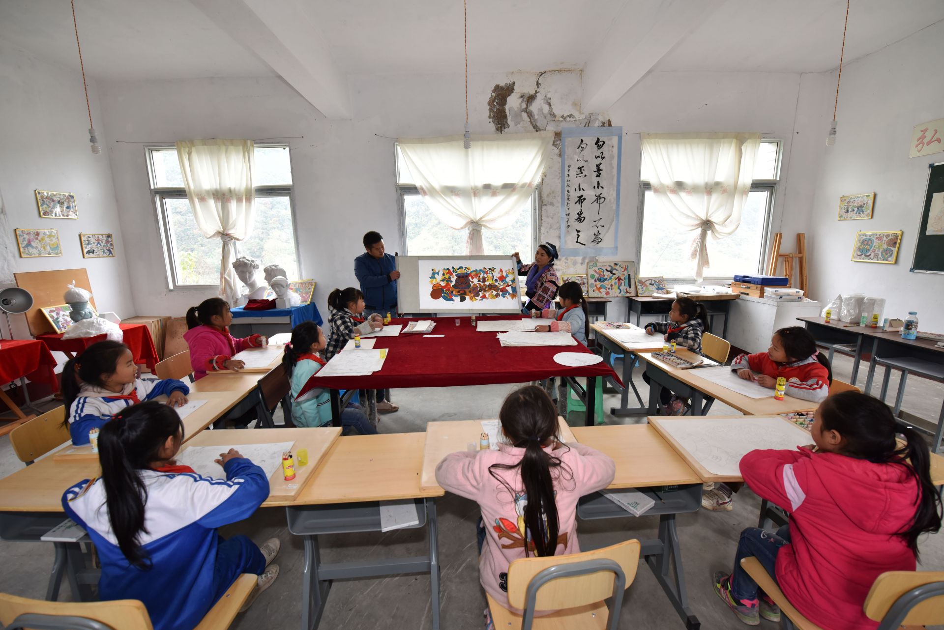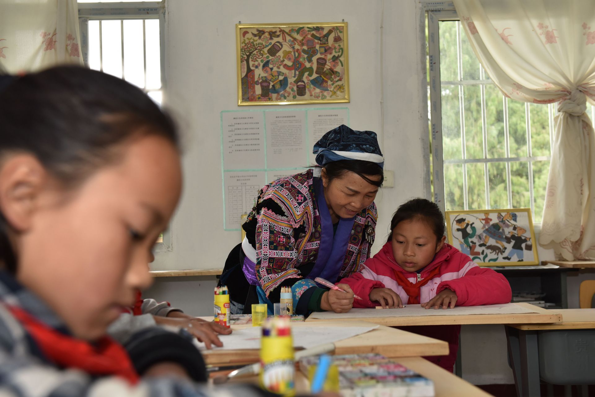 11月22日,在贵州省龙里县洗马镇平坡小学美术室,兰群给学生们上苗画绘画课。新华社发(龙毅 摄)