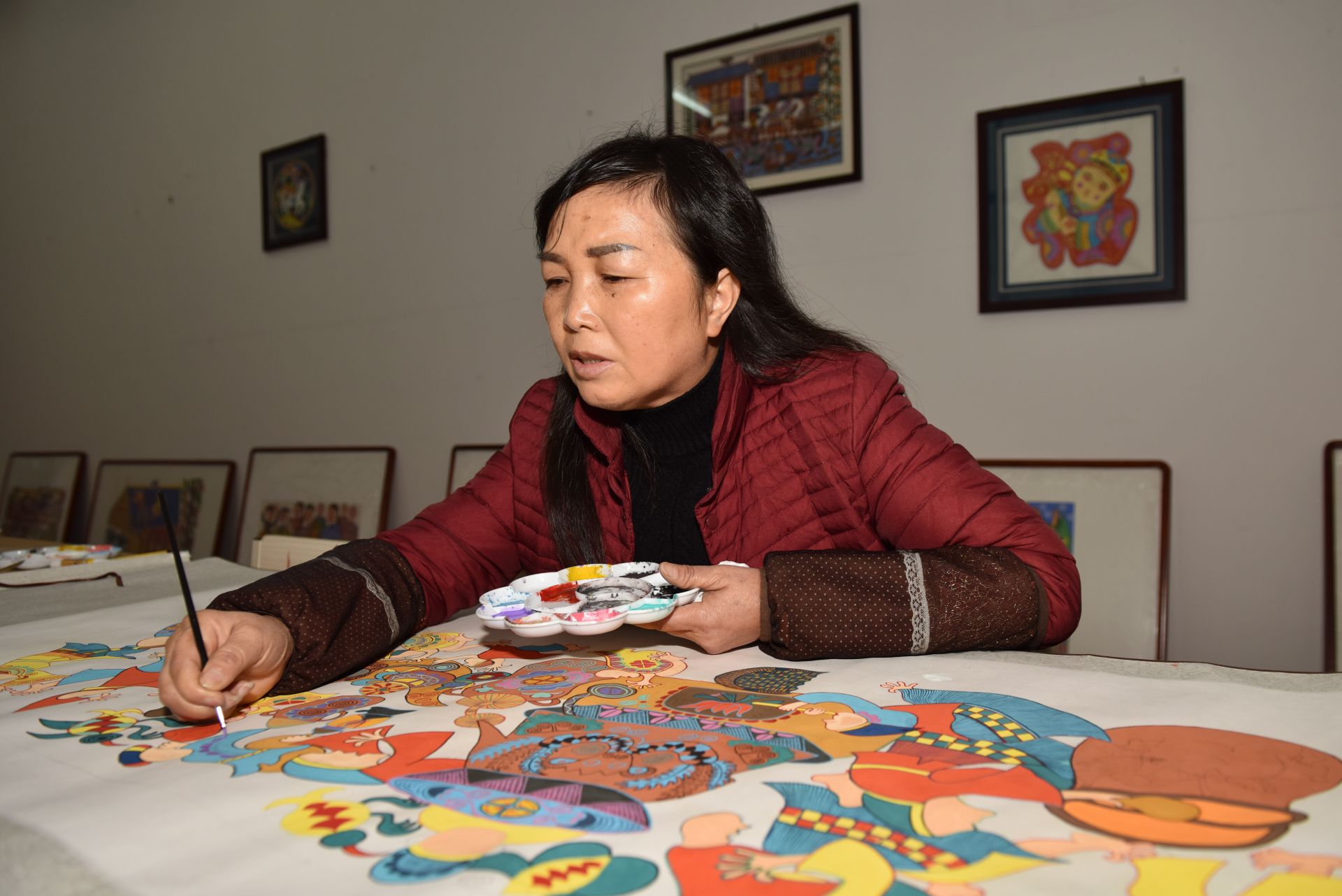 11月22日,在贵州省龙里县洗马镇平坡村苗画培训基地,兰群(中)指导苗族妇女创作苗画。 今年49岁的兰群是平坡苗画的传承人。1988年从师范学校毕业后她选择回到家乡,传承和发扬平坡苗画。 平坡苗画是贵州省龙里县洗马镇平坡村苗族妇女在农闲时,将苗家人的生活劳作、节日庆典、婚丧嫁娶等内容,用苗族独特的审美和绘画技艺创作出的农民艺术品,渐渐受到越来越多游客的青睐。 2013年,兰群注册画廊并申请商标,把平坡苗画推向市场,并免费培训村民们学习苗画。目前,她培训的苗画创作者年创作并销售苗画3000余幅,苗画已成为当地苗族妇女增收的重要来源。兰群说:“平坡苗画是苗族妇女在生产生活过程中的艺术创造,我希望它能很好地传承和发扬。” 新华社发(龙毅 摄)