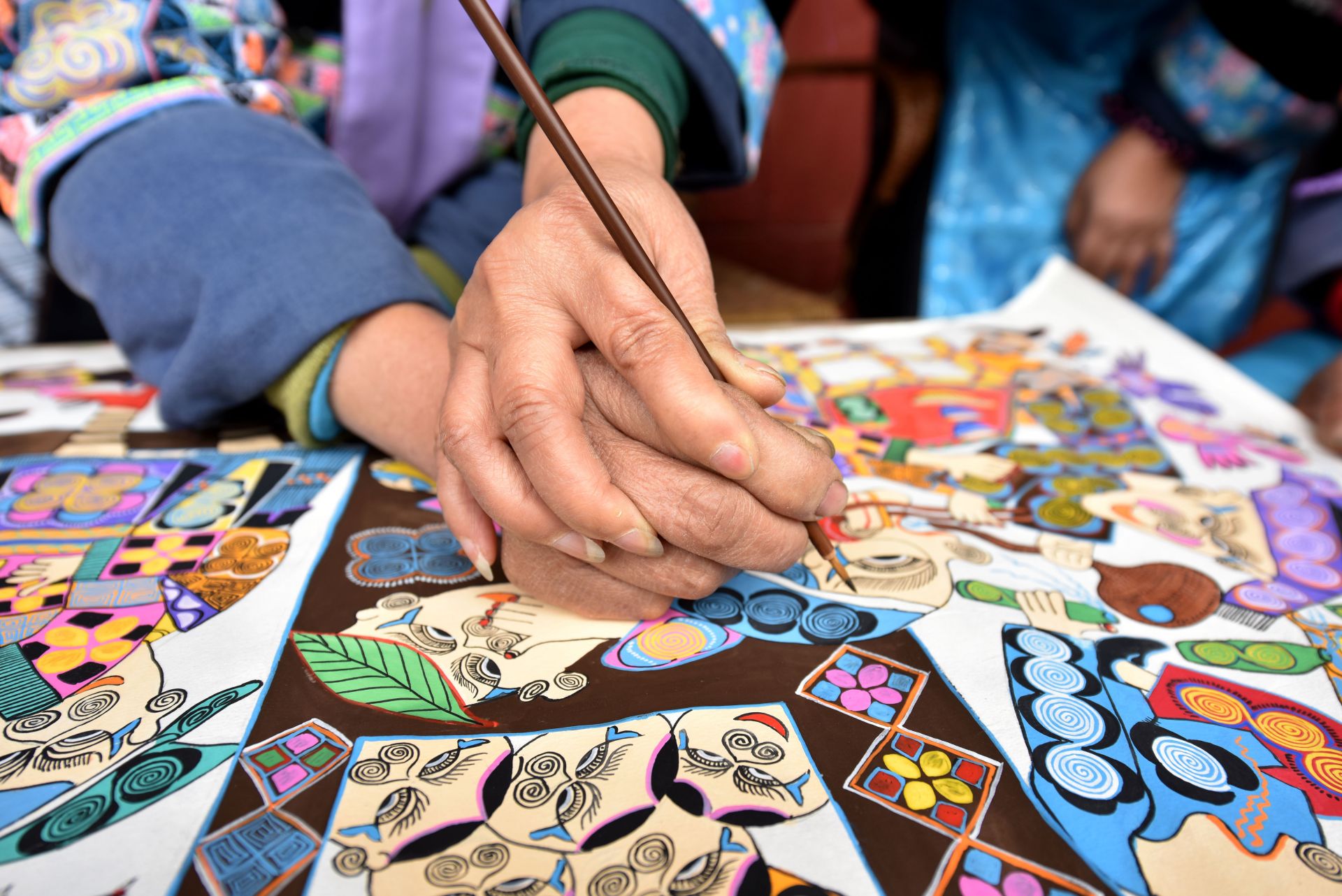 11月22日,在贵州省龙里县洗马镇平坡村苗画培训基地,兰群手把手指导苗族妇女创作苗画。新华社发(龙毅 摄)