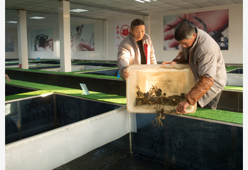 12月17日,在湖州市吴兴区高新区庙港人千亩水产园,蟹农将捕捞的大闸蟹投入暂养池,等待包装。为了更好地保护太湖水环境,2018年上半年起,环太湖区域开始实行“退蟹还湖”,引导在太湖水域围网养殖的蟹农搬迁至内塘养殖。据介绍,浙江省湖州市吴兴区太湖水域蟹农搬迁工作即将全部完成,实现产业环保升级。 新华社记者 翁忻旸 摄