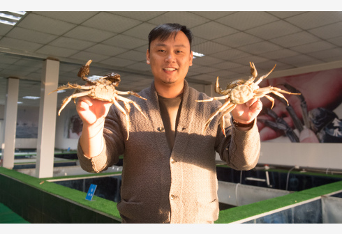 12月17日,在湖州市吴兴区高新区庙港人千亩水产园,水产园负责人展示内塘养殖的大闸蟹。为了更好地保护太湖水环境,2018年上半年起,环太湖区域开始实行“退蟹还湖”,引导在太湖水域围网养殖的蟹农搬迁至内塘养殖。据介绍,浙江省湖州市吴兴区太湖水域蟹农搬迁工作即将全部完成,实现产业环保升级。 新华社记者 翁忻旸 摄