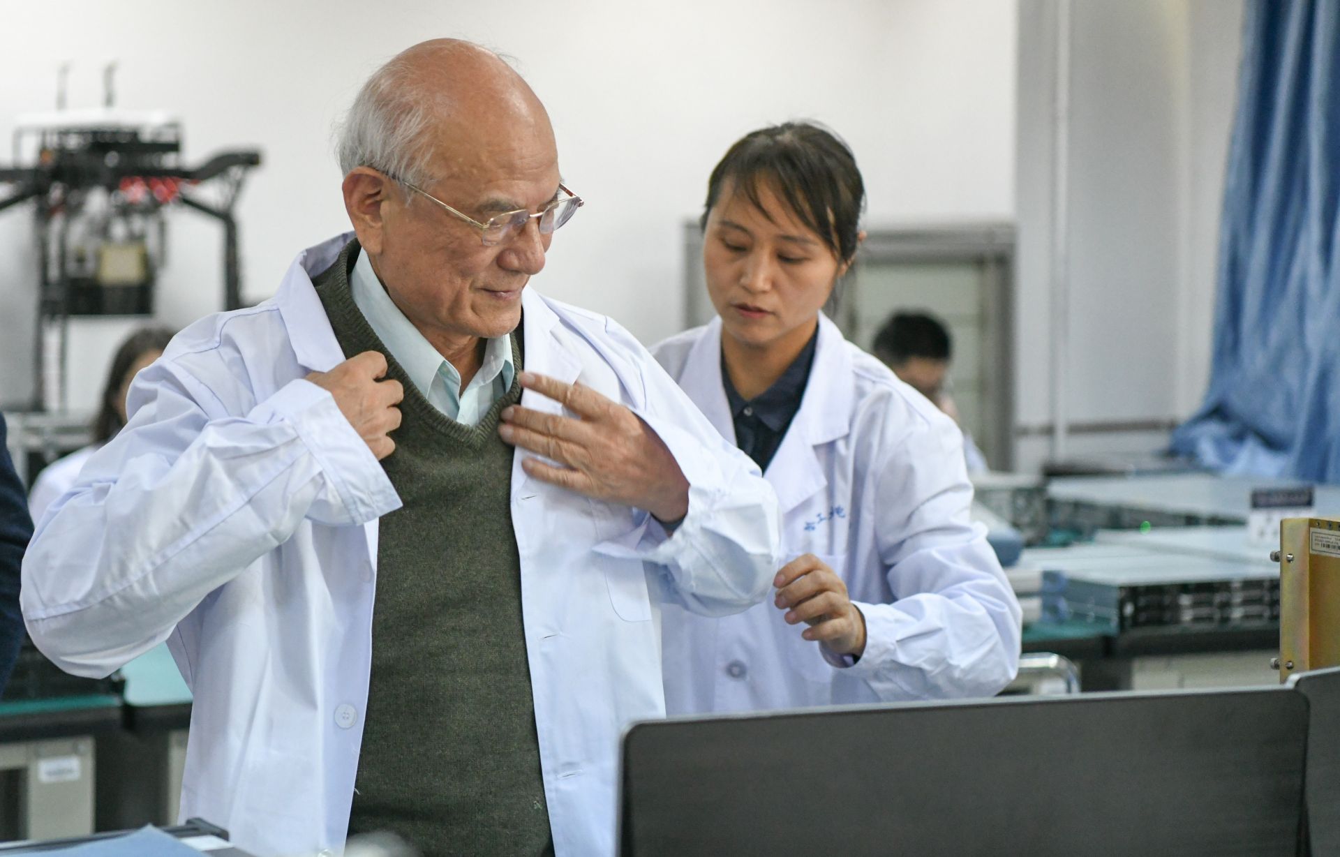 刘永坦(左)在哈尔滨工业大学实验室(2018年12月25日摄)。新华社记者 王松 摄