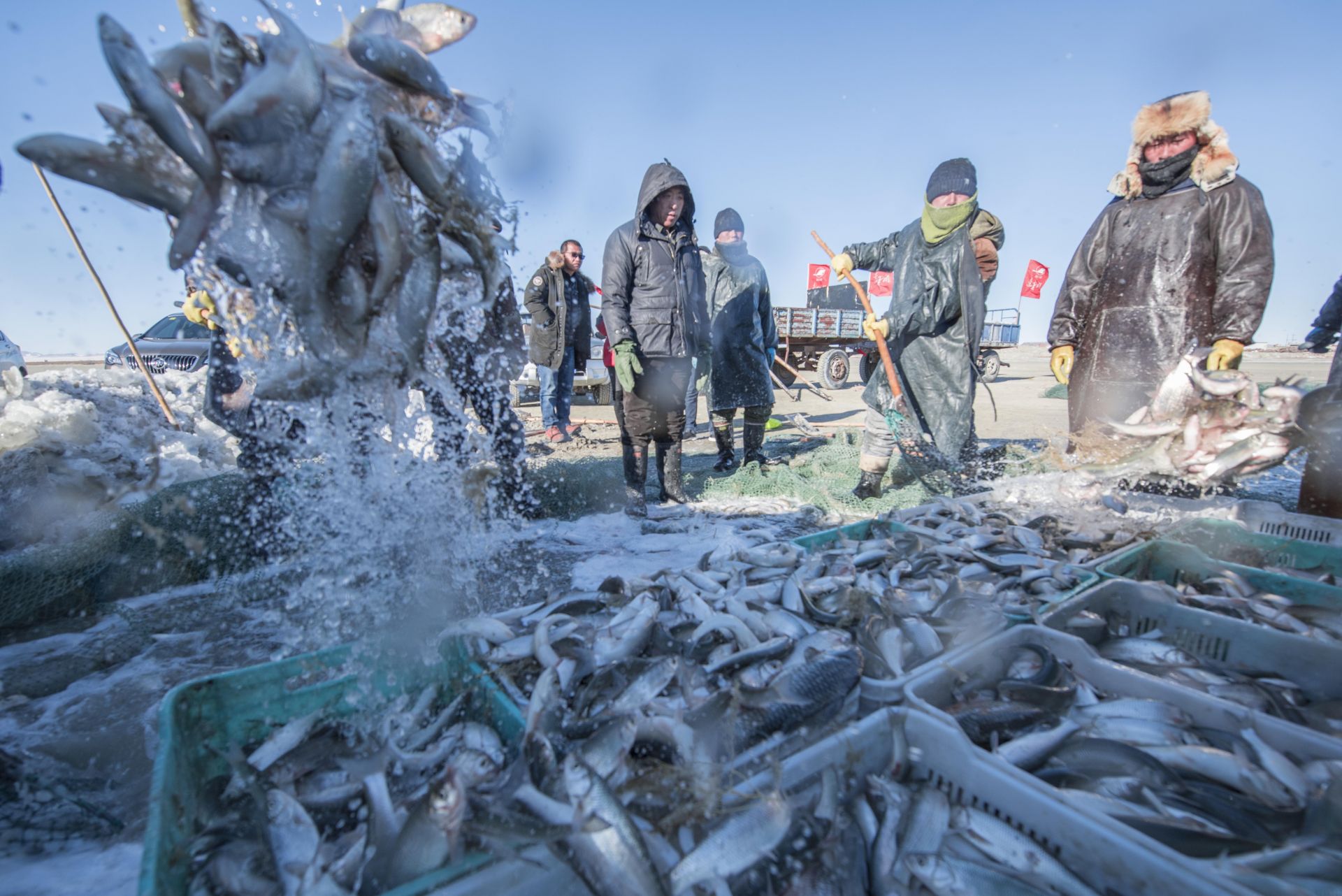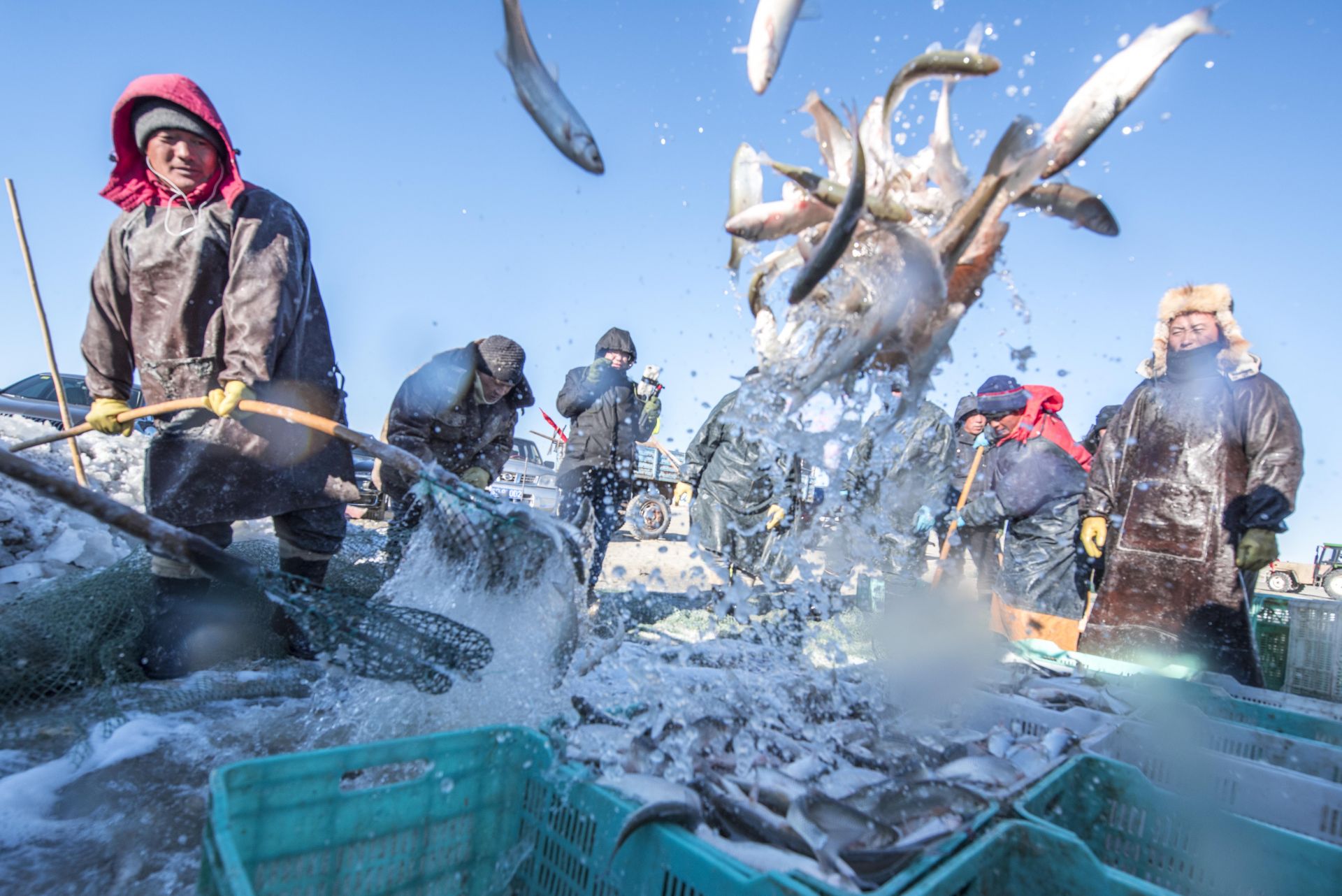 1月8日,在内蒙古达里诺尔湖,渔民在捕捞鲜鱼。新华社发(孙国树 摄)