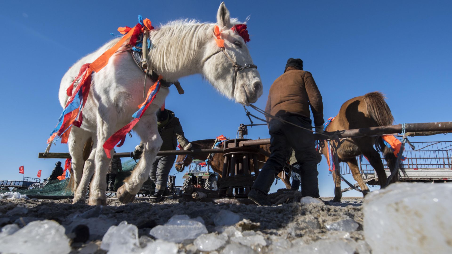 1月8日,在内蒙古达里诺尔湖,渔民用马拉绞盘拉动渔网的方式冬捕。新华社发(孙国树 摄)