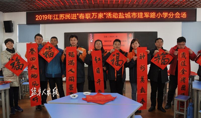 1月24日下午,在江苏民进“春联万家”活动盐城分会场,书画家们热情满怀,书写了一大批喜迎新年和赞颂祖国大好形势内容的春联及书法作品,赠送社区群众。盐阜大众报报业集团全媒体记者 黄海峰 摄