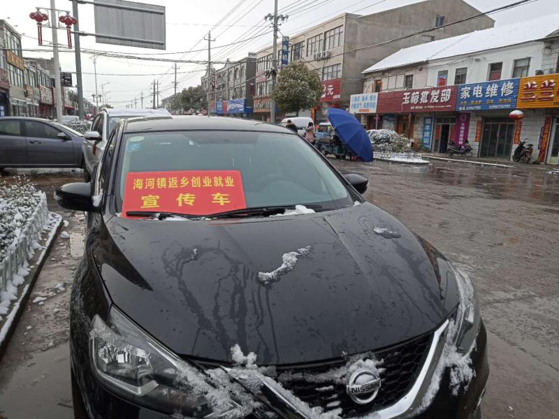 射阳县海河镇春节期间利用宣传车在全镇范围内广泛宣传我县和镇的返乡创业就业政策,把企业的空岗信息送到群众的家门口在全镇悬挂横幅百余条,组织规模招工五场次,务工人员签订就业协议二百多人。
