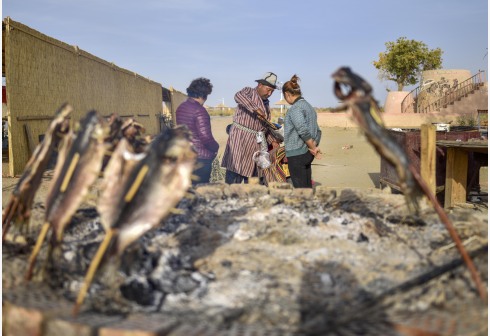 在新疆尉犁县罗布人村寨里,罗布人阿布冬(中)在销售自己做的烤鱼(2018年10月16日摄)。2018年,新疆全年旅游人数突破1.5亿人次,增长40%以上。2019年春节假期,接待游客超过300万人次,创历史新高。 新华社记者 赵戈 摄