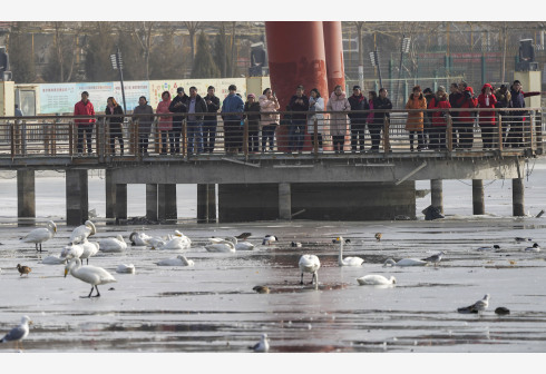 在库尔勒市杜鹃河栖息的天鹅引来市民驻足观赏(2月11日摄)。2018年,新疆全年旅游人数突破1.5亿人次,增长40%以上。2019年春节假期,接待游客超过300万人次,创历史新高。 新华社记者 赵戈 摄