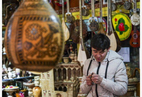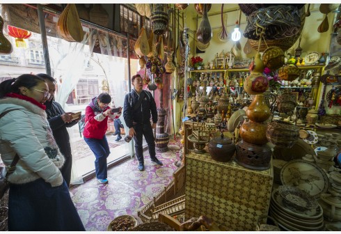 在新疆喀什古城景区阿热亚路一家木器店里,游客在挑选商品(2月16日摄)。2018年,新疆全年旅游人数突破1.5亿人次,增长40%以上。2019年春节假期,接待游客超过300万人次,创历史新高。 新华社记者 赵戈 摄