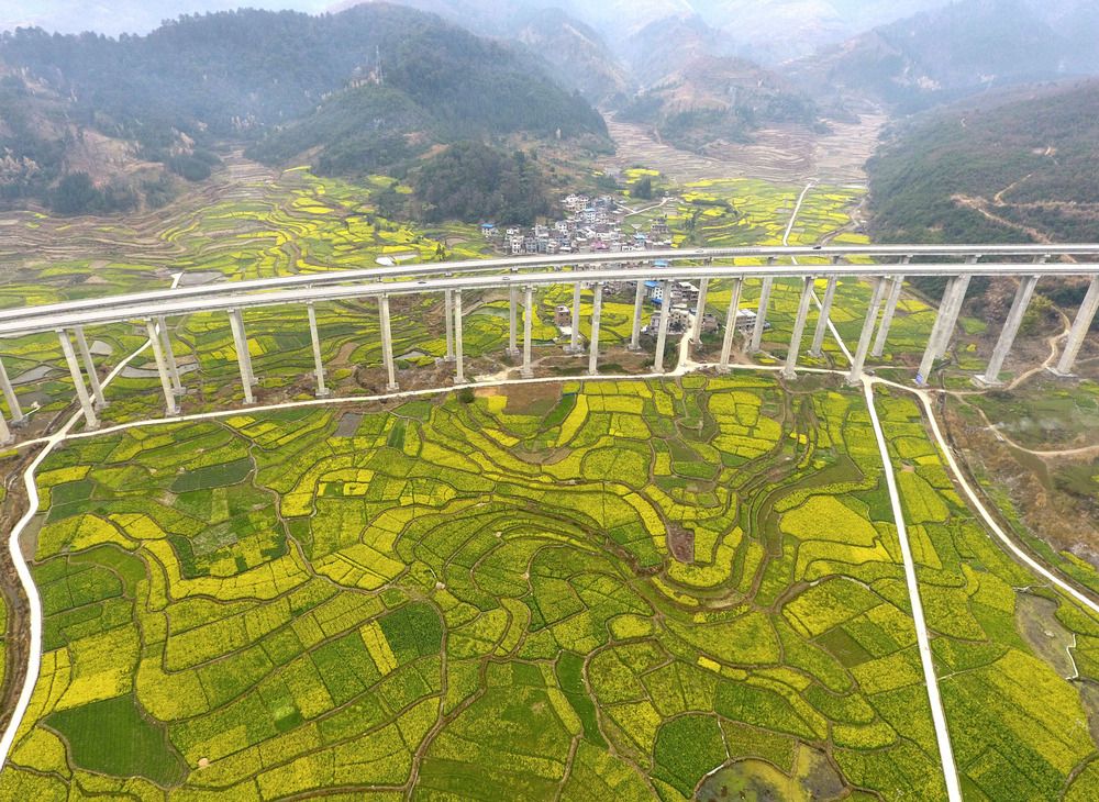 这是在贵州省从江县上皮林村拍摄的农田和桥梁(3月4日无人机拍摄)。 初春时节,贵州各地风光旖旎,美丽乡村风景如画。 新华社发(王炳真 摄)