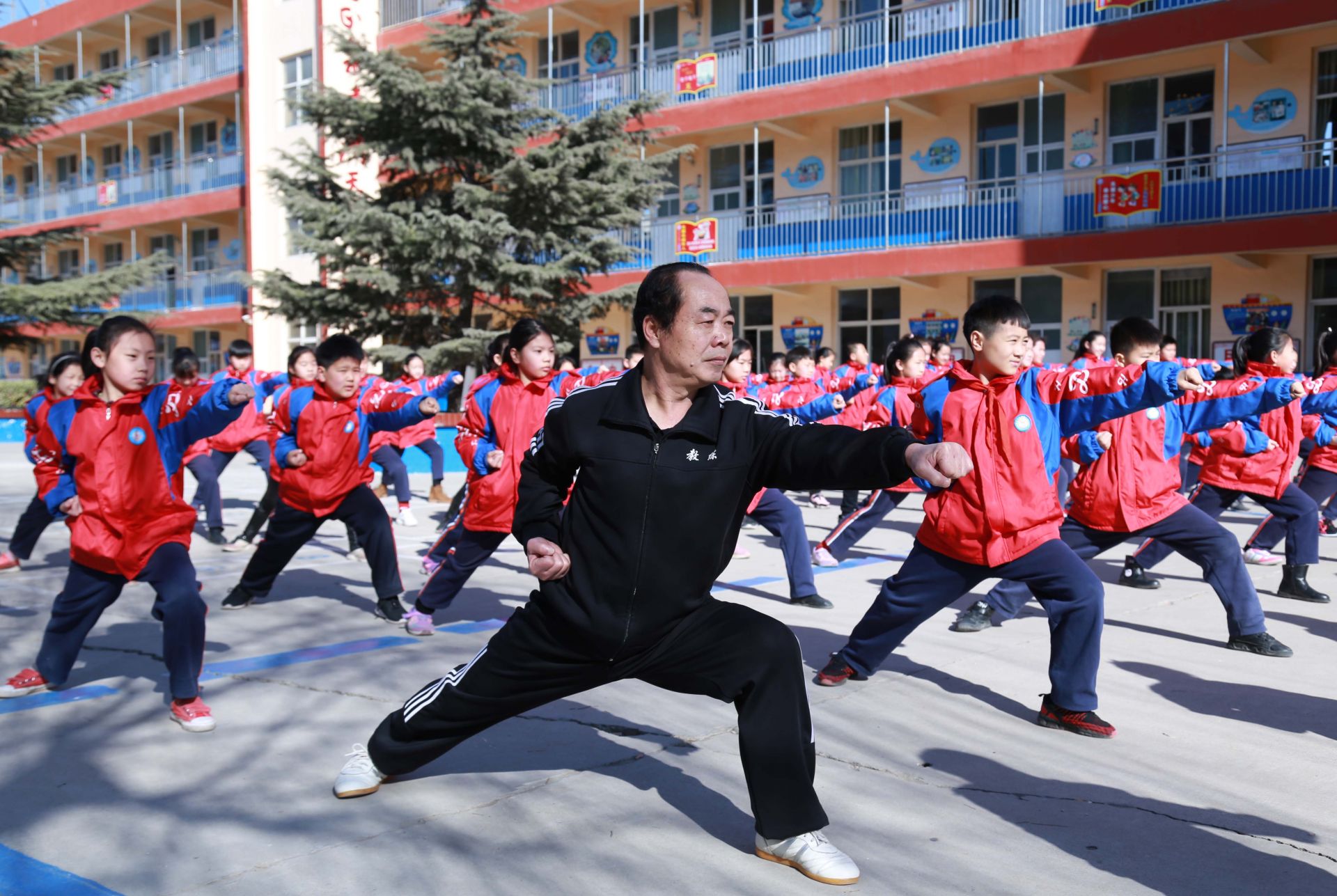 3月11日,在河北省邢台市桥西区达活泉小学,武师潘思举带领学生练习非遗武术项目——查拳。 近年来,河北省邢台市大力推进传统武术走进校园,保护传承传统文化,提高学生身体素质。 新华社发(张驰 摄)