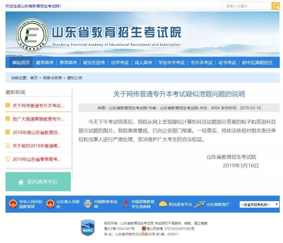 山东教育招生考试院回应“专升本考试疑似泄题”称,已向公安部门报案。
