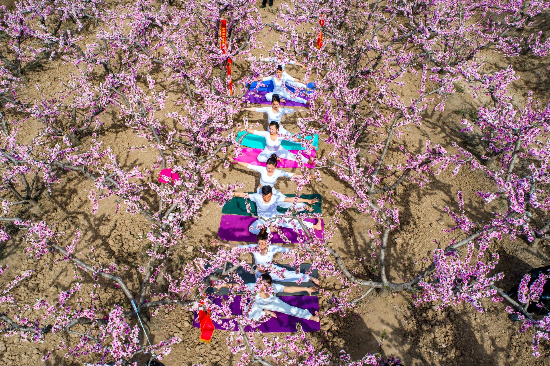 3月26日,瑜伽爱好者在运城市陶村镇辛曹村桃花岭练习瑜伽(无人机拍摄)。新华社记者 曹阳 摄