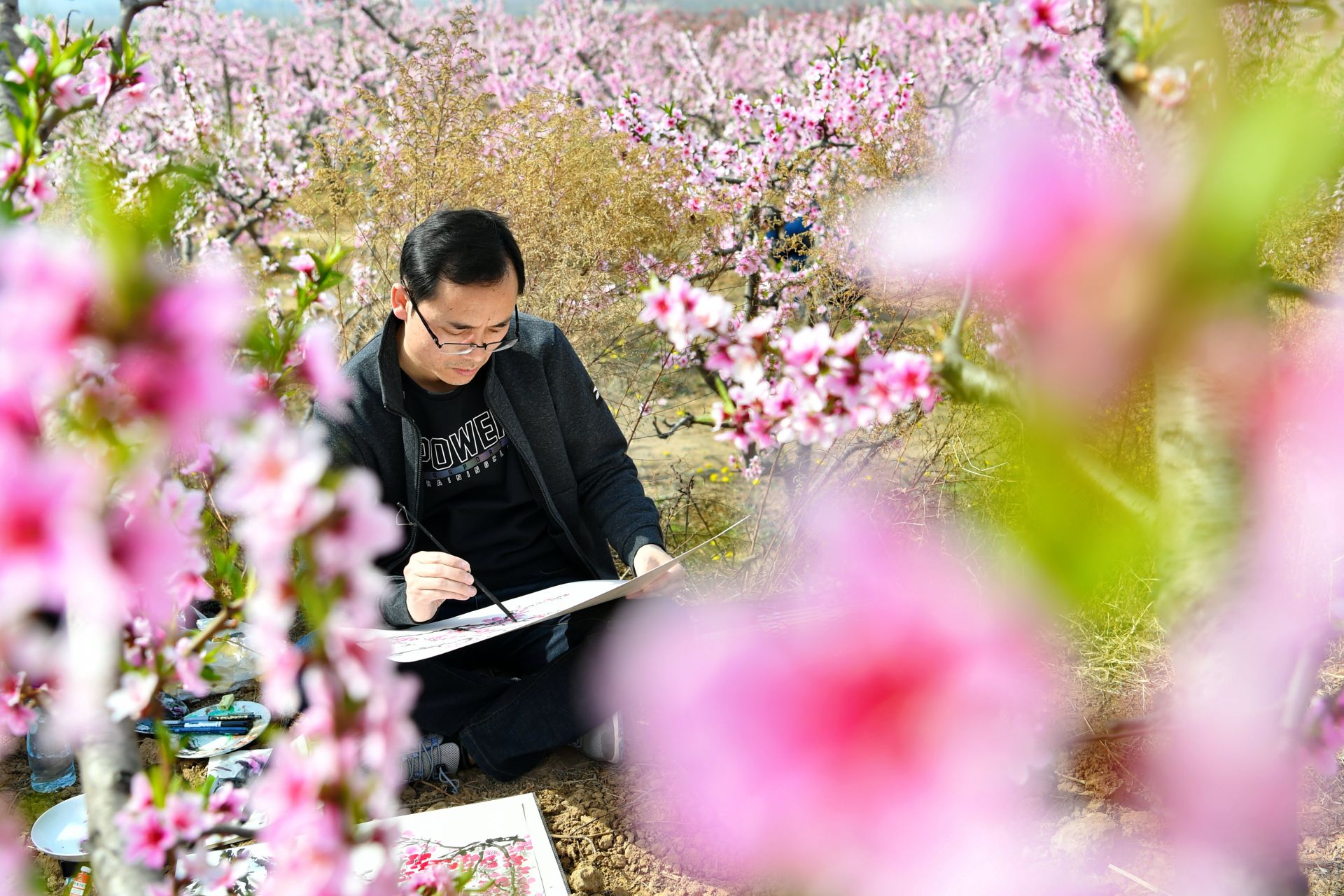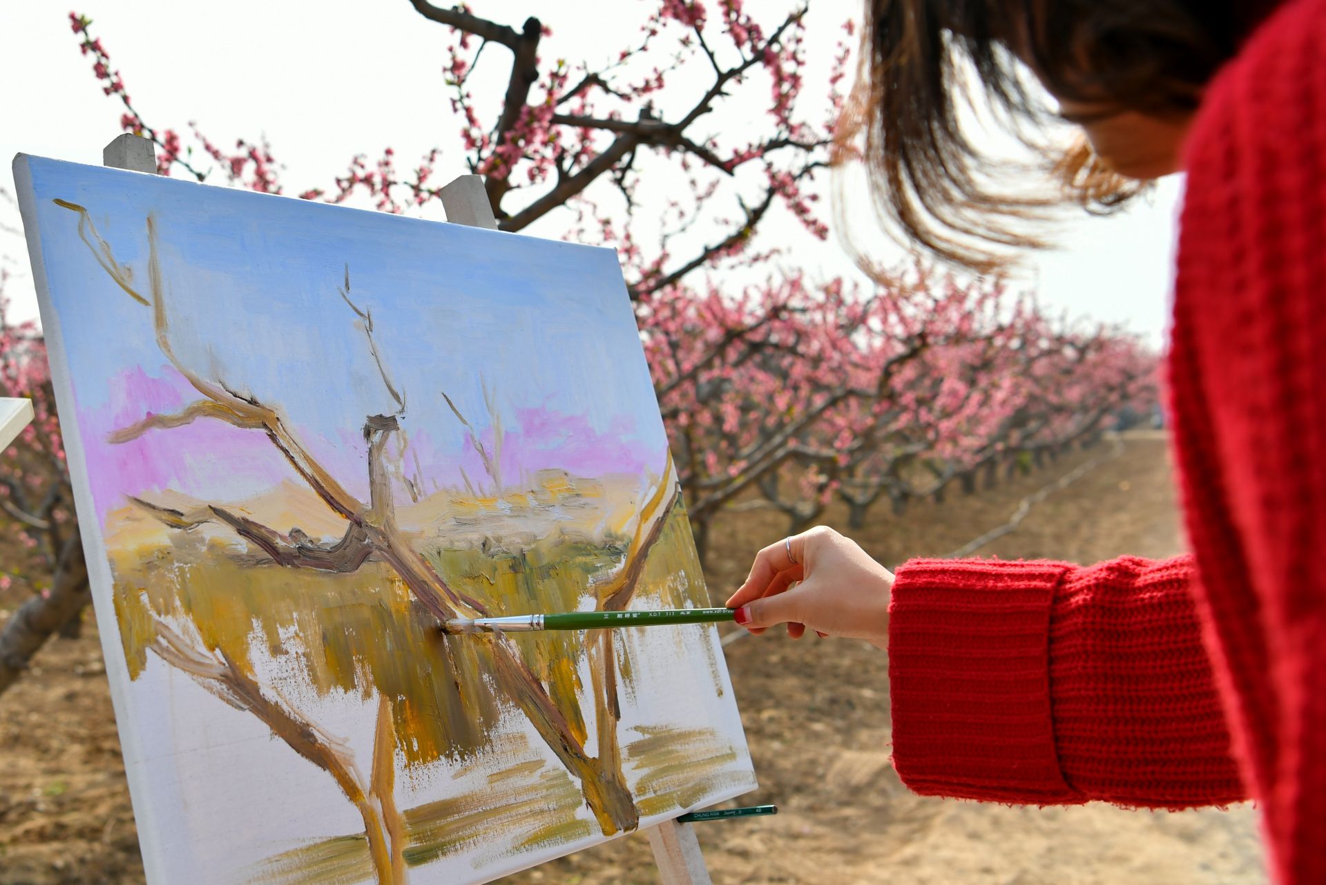 3月26日,一名学生在山西省运城市陶村镇辛曹村桃花岭写生。新华社记者 曹阳 摄