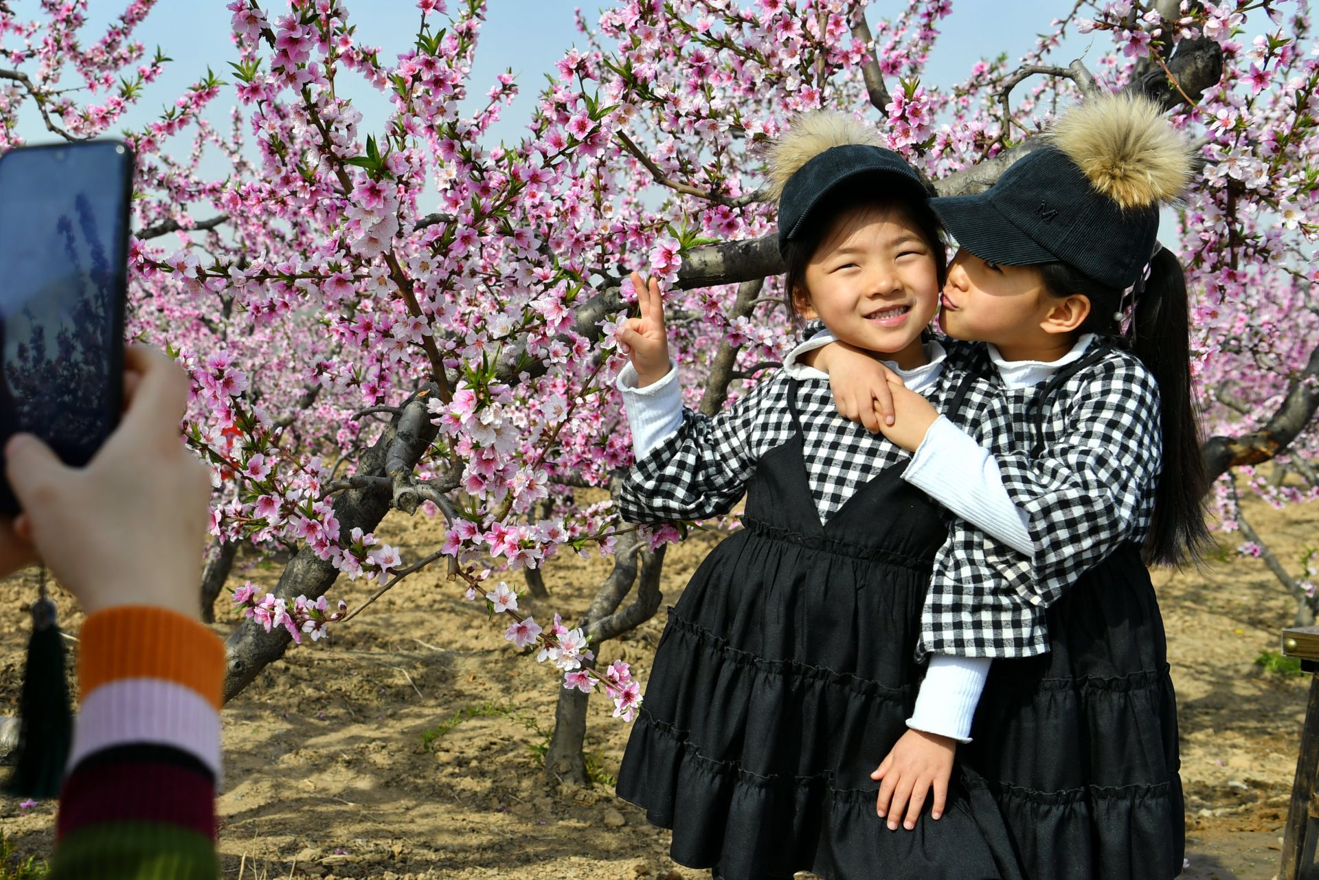 3月26日,两位小游客在运城市陶村镇辛曹村桃花岭桃林中合影。新华社记者 曹阳 摄