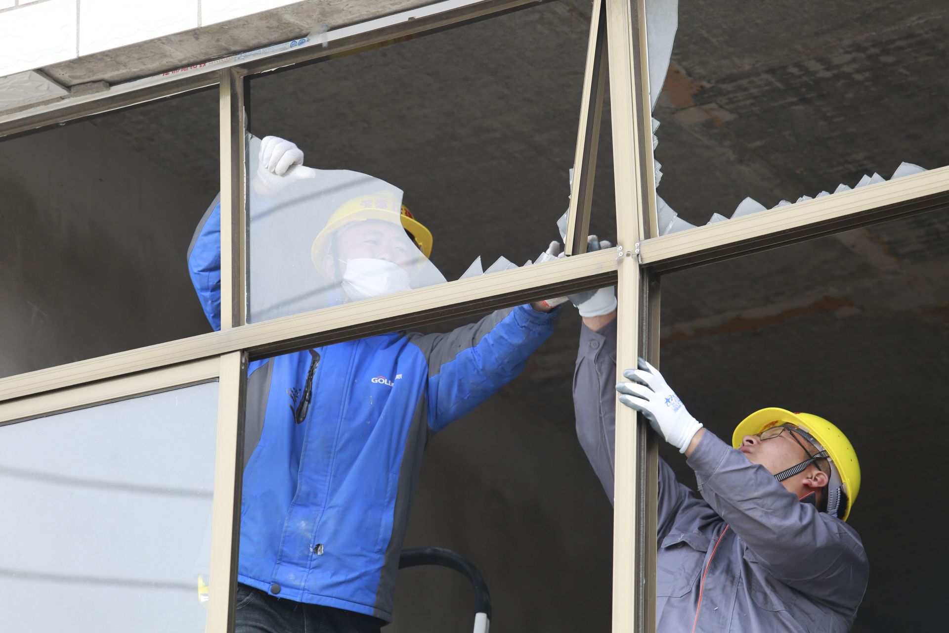 工人正在清理玻璃残渣。 盐阜大众报报业集团全媒体见习记者 钱晨 摄