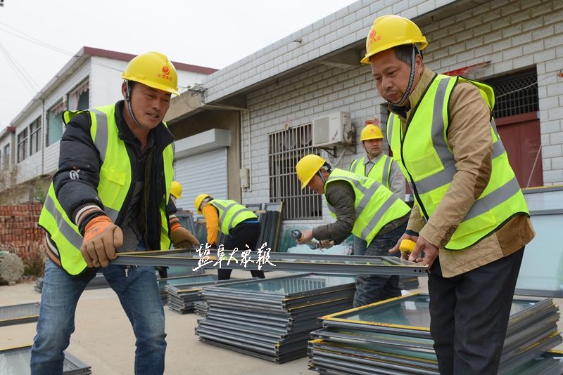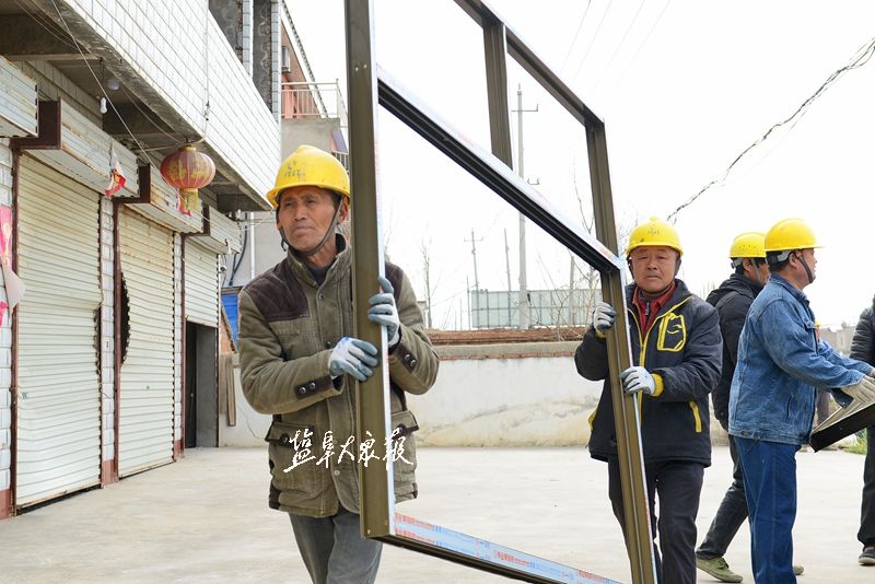 3月28日上午,陈家港镇四港村一组,工人们将玻璃窗成品搬运至规定地方,统一安装。盐阜大众报报业集团全媒体记者 李思远 摄