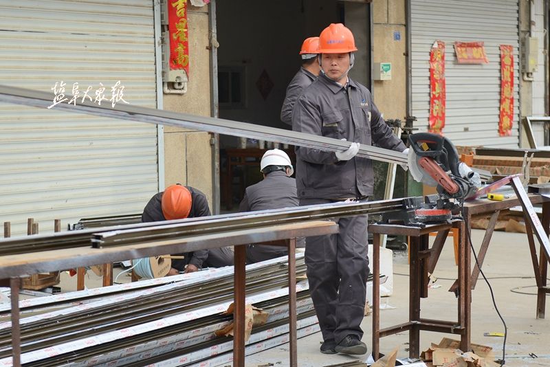 3月28日上午,在陈家港镇立礼村,工人们正在切割门框材料。盐阜大众报报业集团全媒体记者 李思远 摄