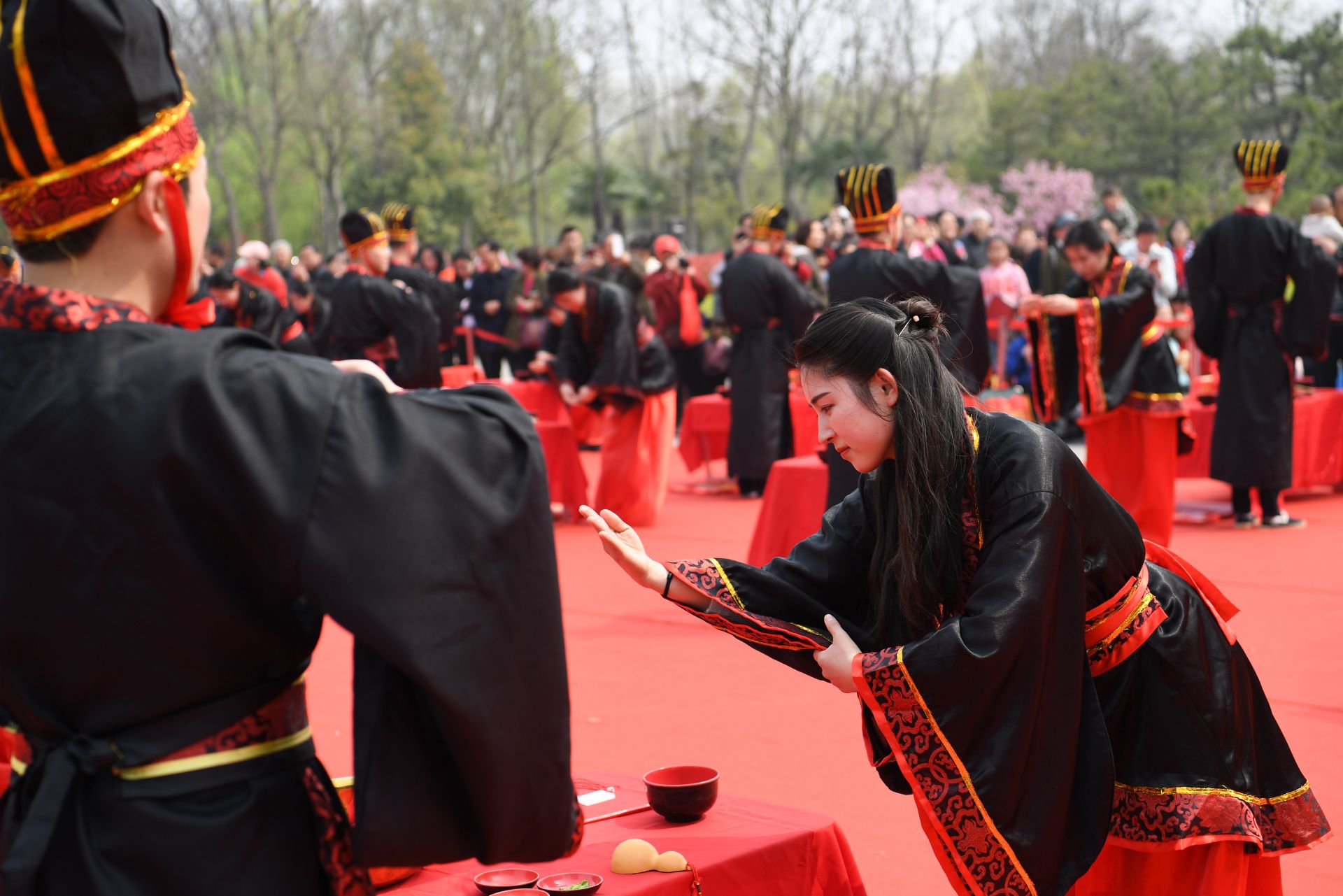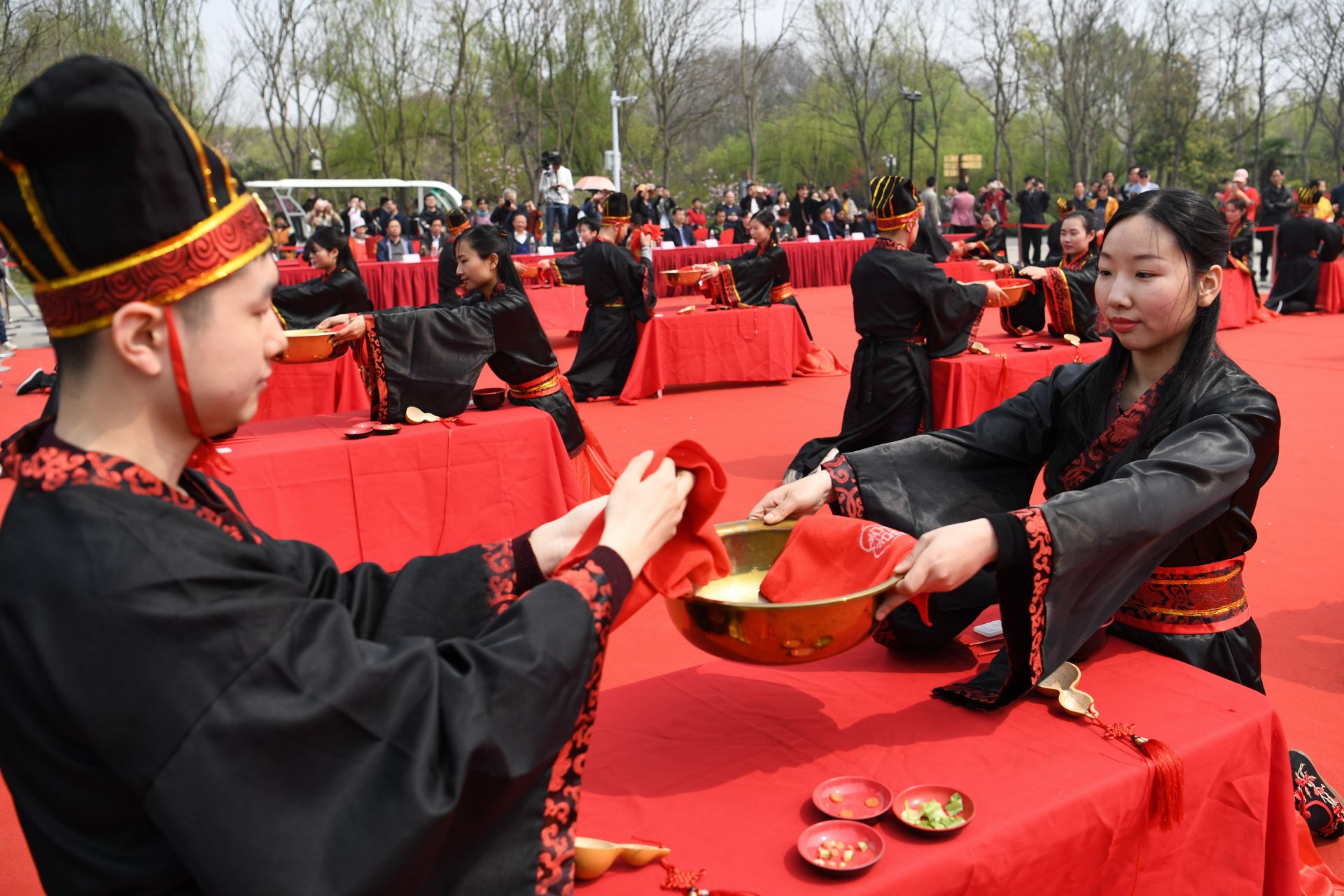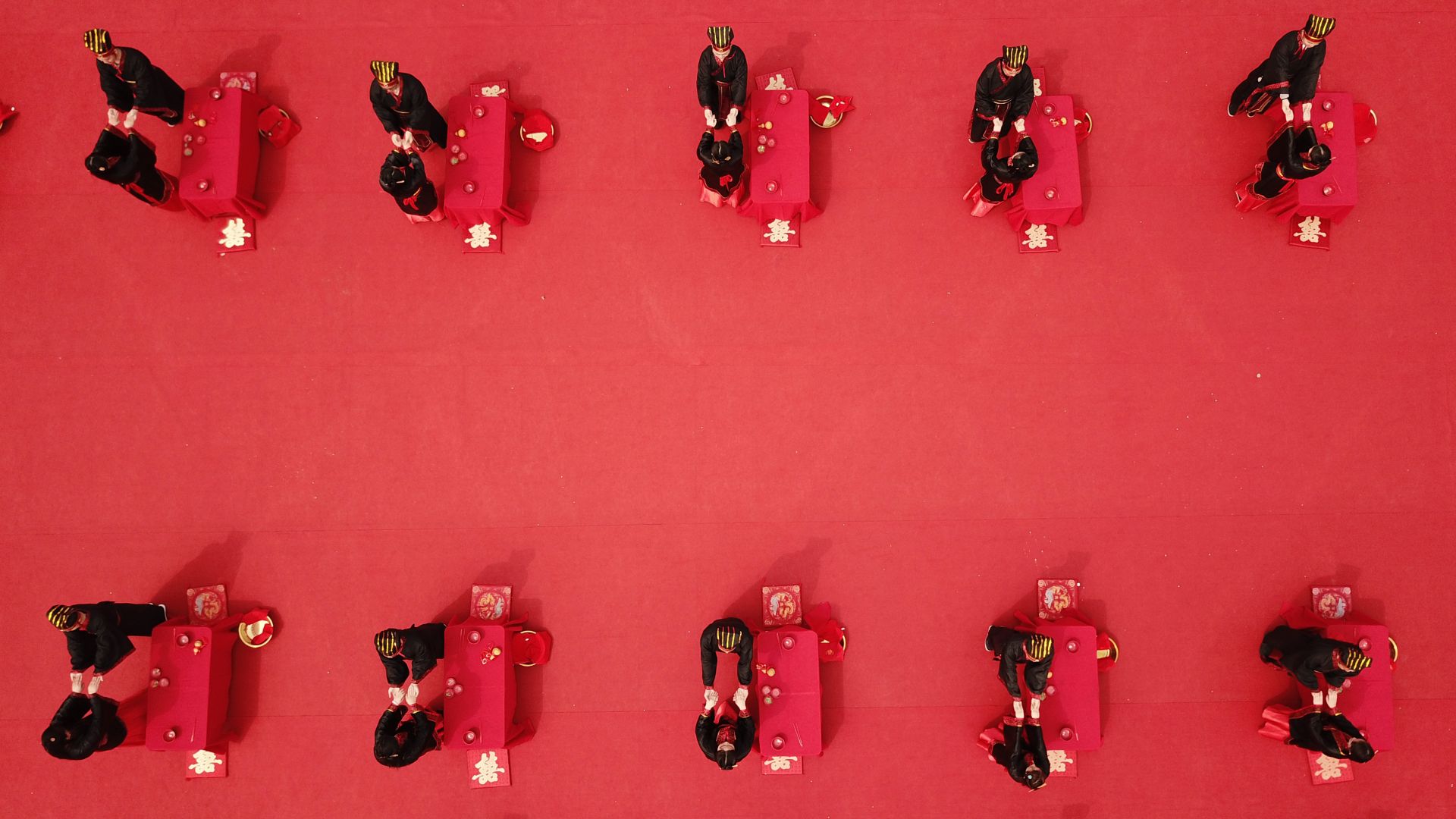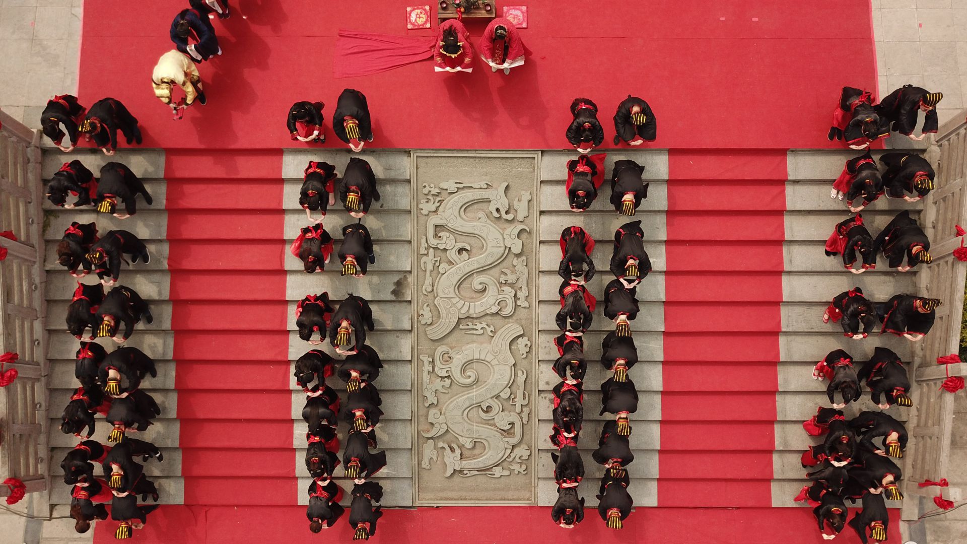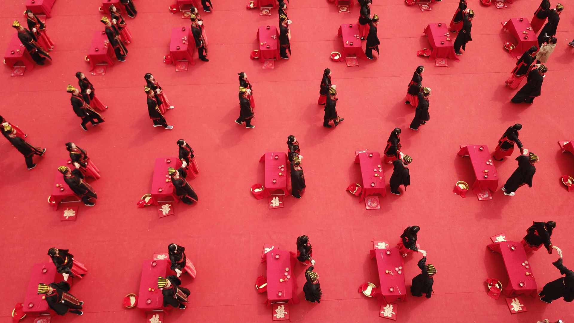 3月30日,新人们在参加汉式集体婚礼(无人机拍摄)。新华社记者 张端 摄