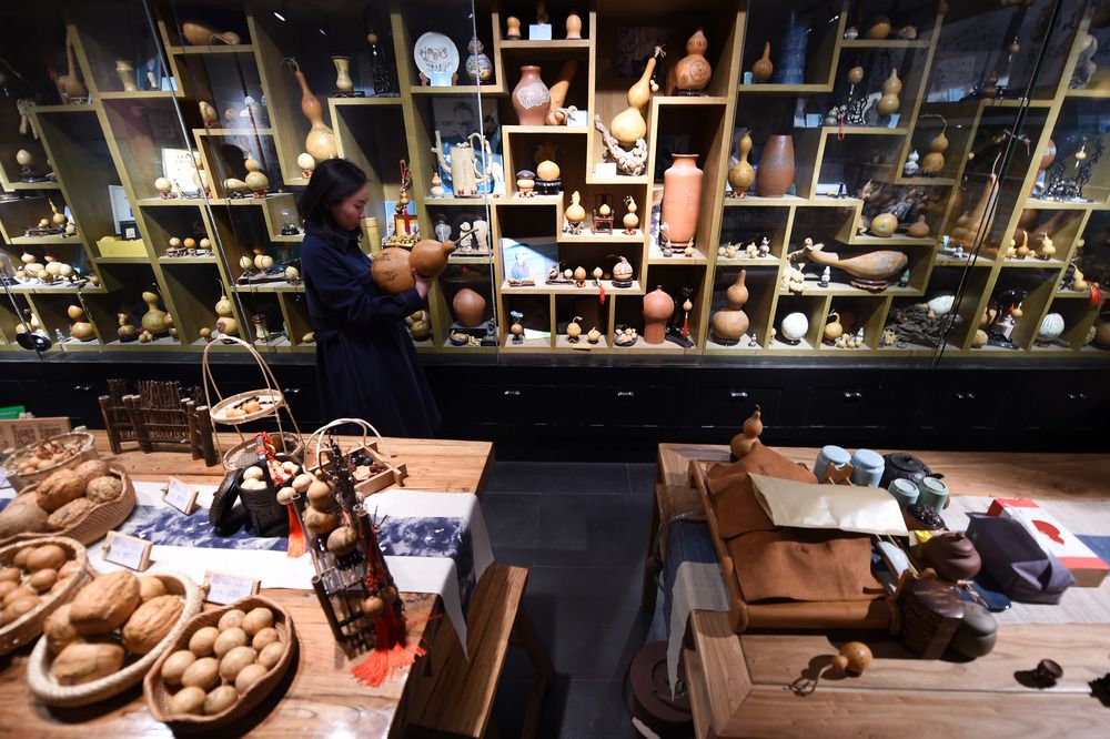 在兰州刻葫芦传习所,兰州阮氏雕刻葫芦艺术第四代传人阮熙越从雕刻葫芦展柜前走过(4月1日摄)。 兰州刻葫芦是一种独特的中国民间技艺,主要以刀和针为工具,在葫芦表面进行阴刻,图案以中国传统绘画山水、花鸟、人物和书法为主。图案刻好后涂上松墨,令其线条明晰。兰州刻葫芦,刻工精细绝妙,注重传神写意,艺术感染力强,深受国内外鉴赏者喜爱,2006年被纳入甘肃省第一批非物质文化遗产。 新华社记者 范培珅 摄