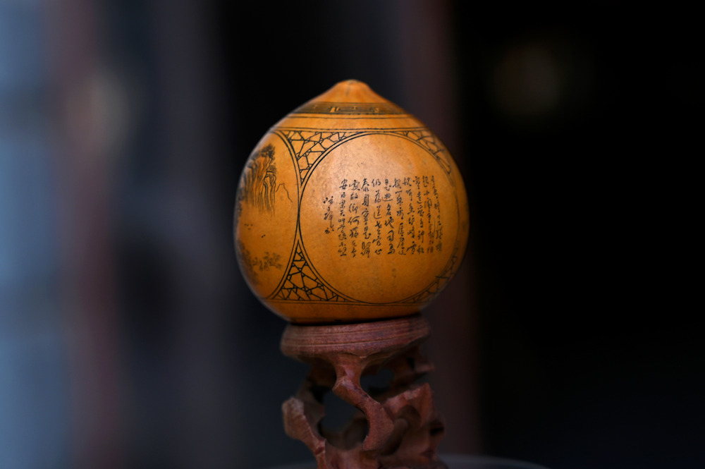 这是3月31日在兰州刻葫芦传习所拍摄的中国工艺美术大师阮文辉雕刻的葫芦作品《诗配画》。 新华社记者 刘洁 摄
