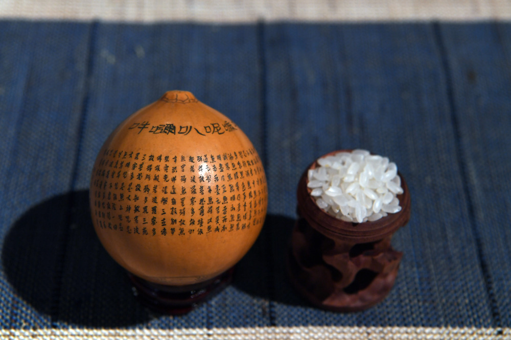 这是4月1日在兰州刻葫芦传习所拍摄的甘肃省工艺美术大师阮琳雕刻的葫芦作品《心经》与一小撮米粒的对比图。 新华社记者 范培珅 摄