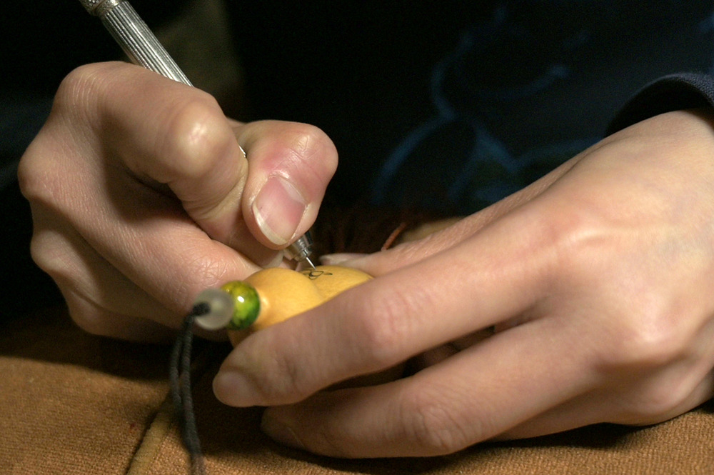 这是3月31日在兰州刻葫芦传习所拍摄的甘肃省工艺美术大师阮一舟雕刻葫芦瞬间。 新华社记者 刘洁 摄