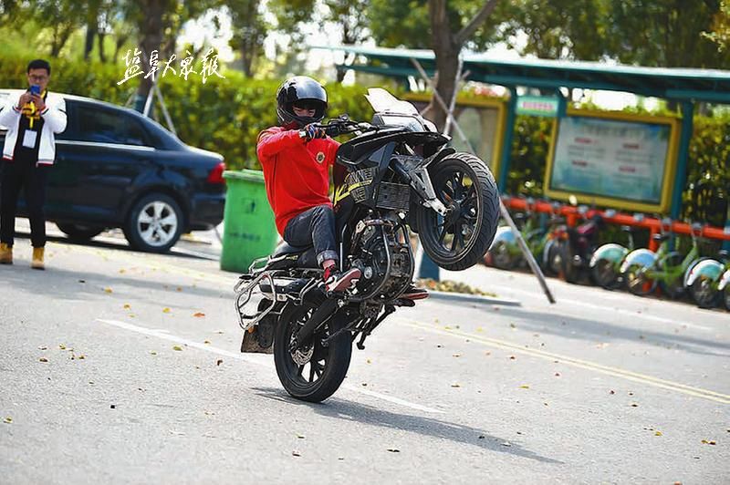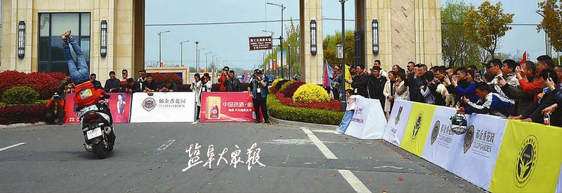 摩托车倒立骑行表演吸引不少市民前来观看。