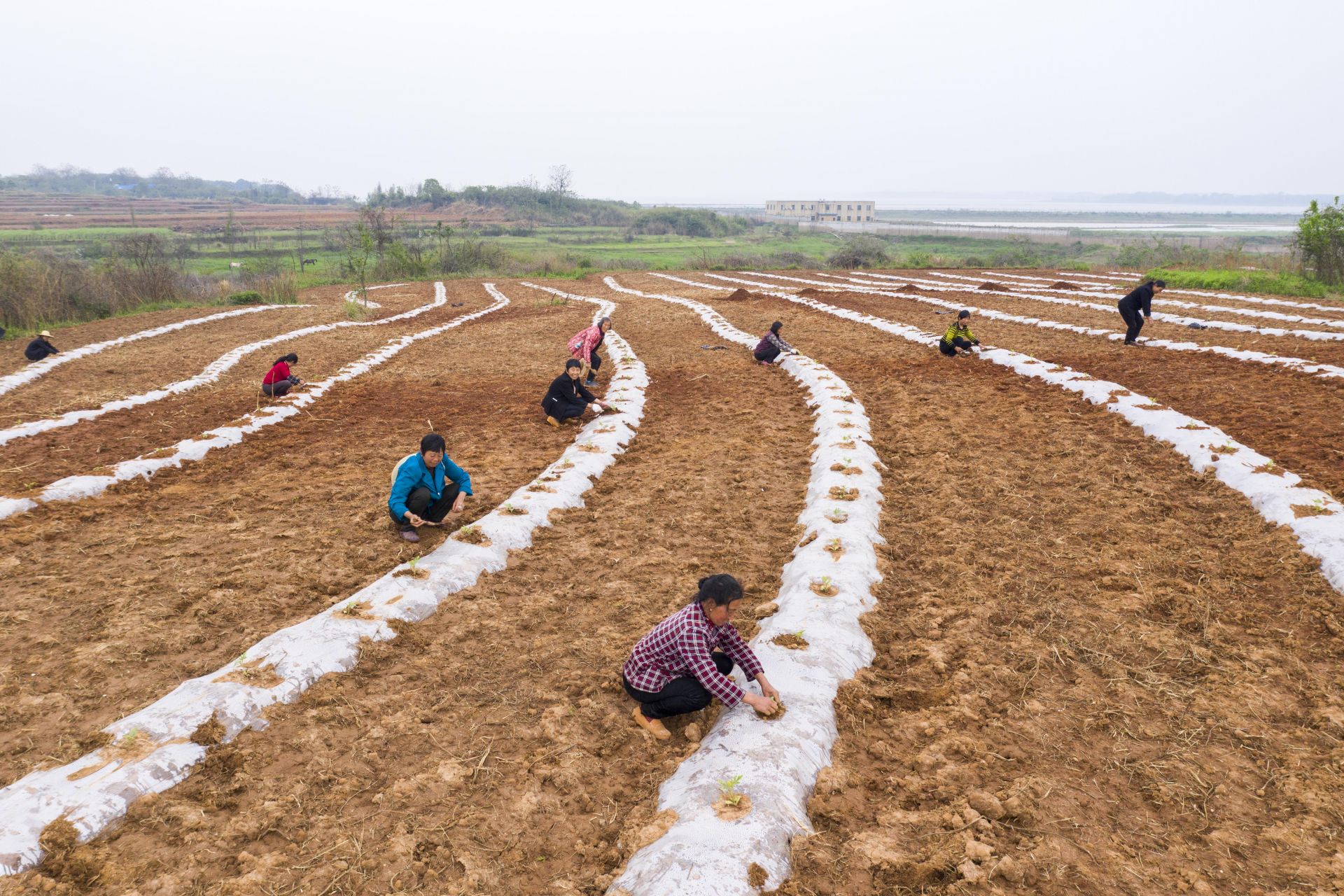 4月15日,在江西九江都昌县万户镇西湖村西瓜种植基地,人们栽种西瓜苗。新华社发(傅建斌 摄)
