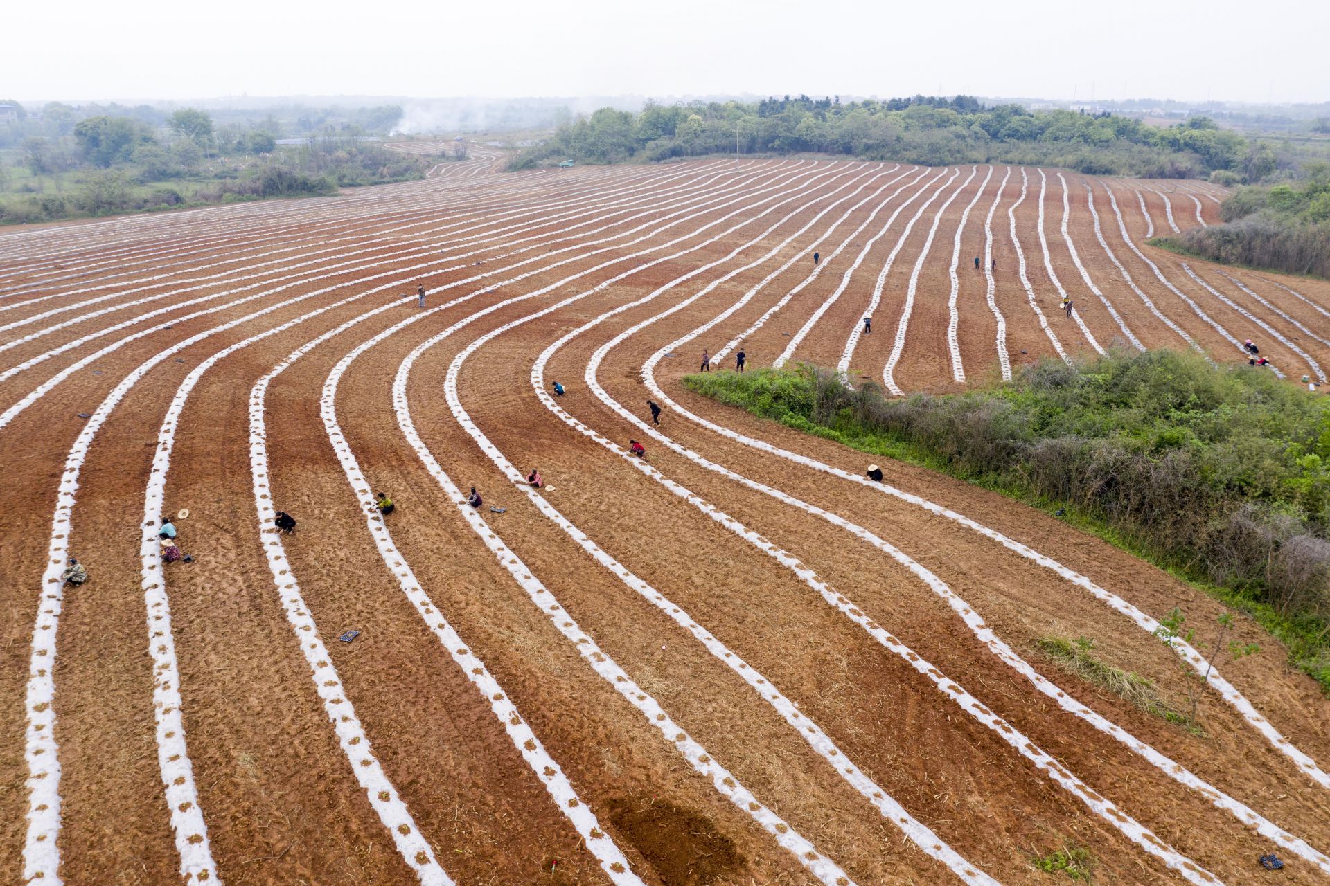4月15日,在江西九江都昌县万户镇西湖村西瓜种植基地,人们栽种西瓜苗(无人机拍摄)。 暮春时节,在江西九江都昌县万户镇西湖村,鄱阳湖畔地膜纵横的瓜田如一条条“跑道”,当地农户运苗种苗,奔波在“跑道”上,一派繁忙的景象。 新华社发(傅建斌 摄)