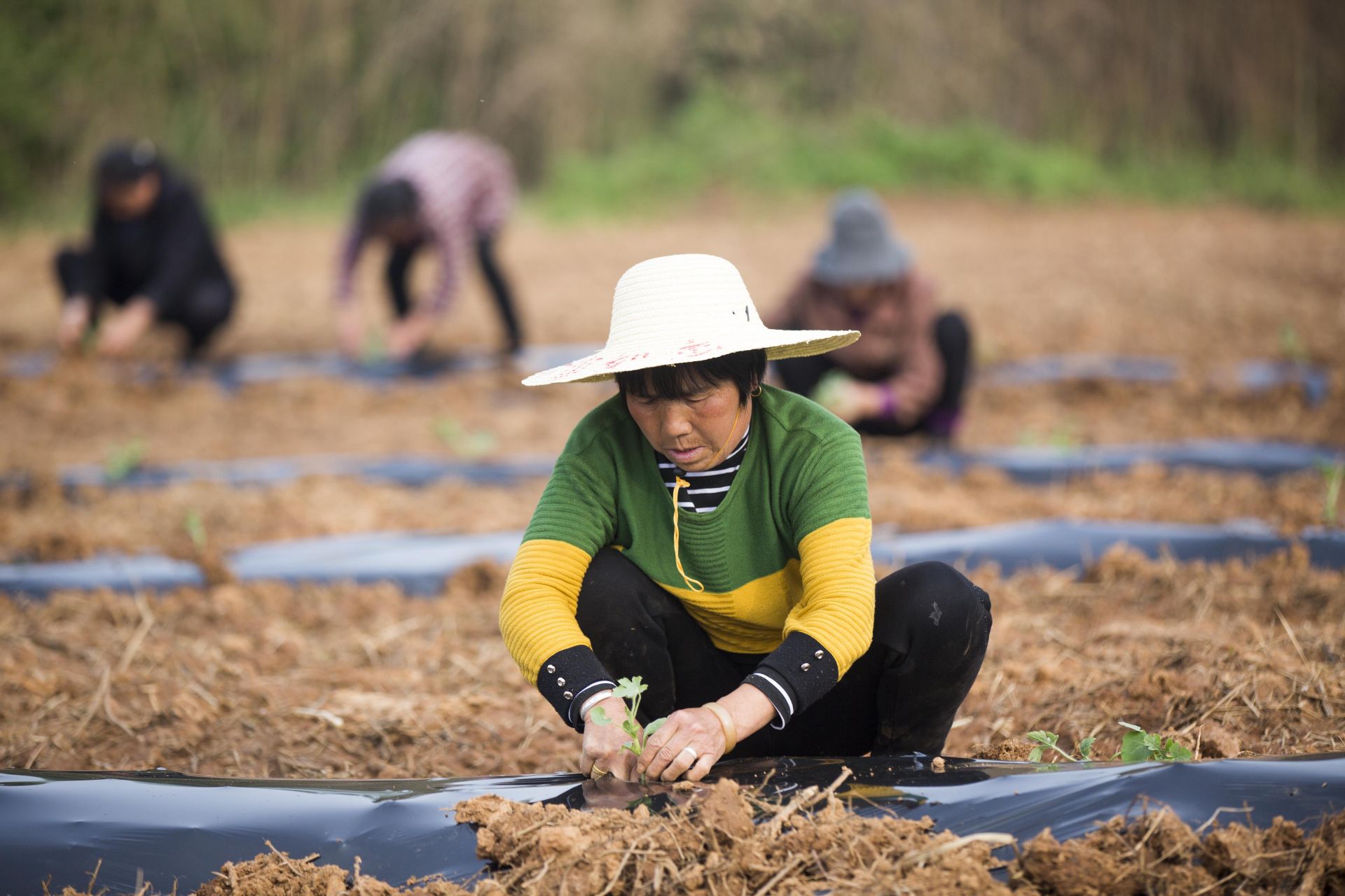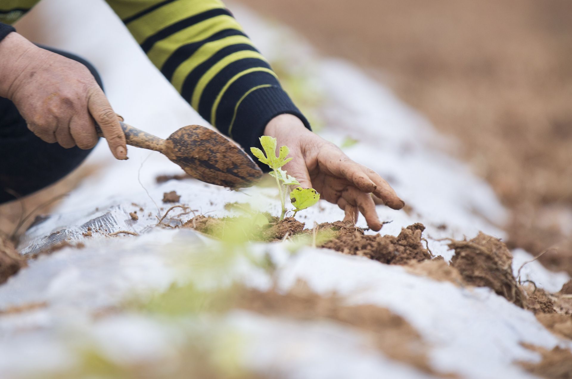 4月15日,在江西九江都昌县万户镇西湖村西瓜种植基地,一名村民栽种西瓜苗。新华社发(傅建斌 摄)