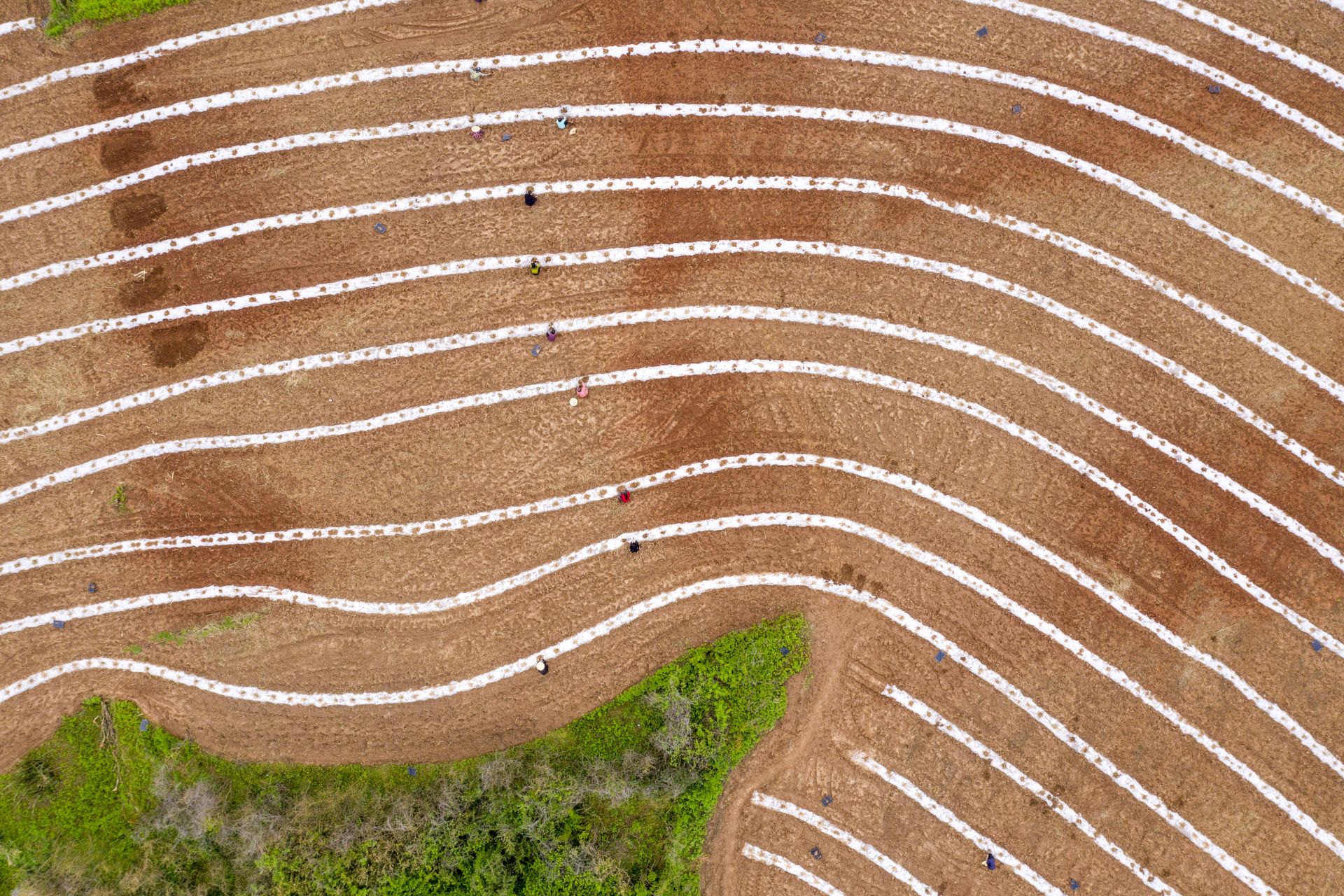 4月15日,在江西九江都昌县万户镇西湖村西瓜种植基地,人们栽种西瓜苗(无人机拍摄)。新华社发(傅建斌 摄)