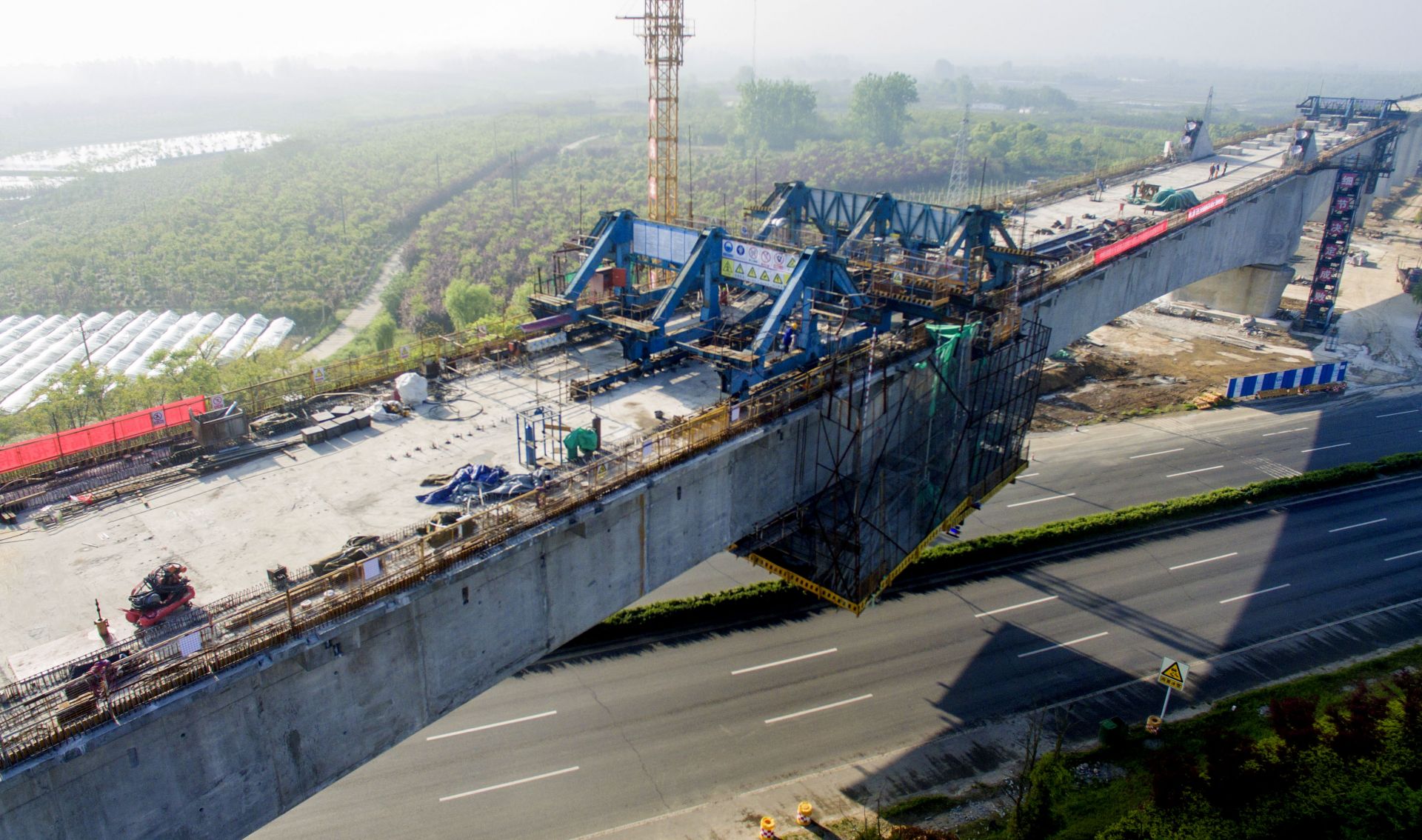 这是4月16日拍摄的正在合龙中的合安高铁花岗特大桥跨206国道连续梁拱桥。新华社记者 刘军喜 摄