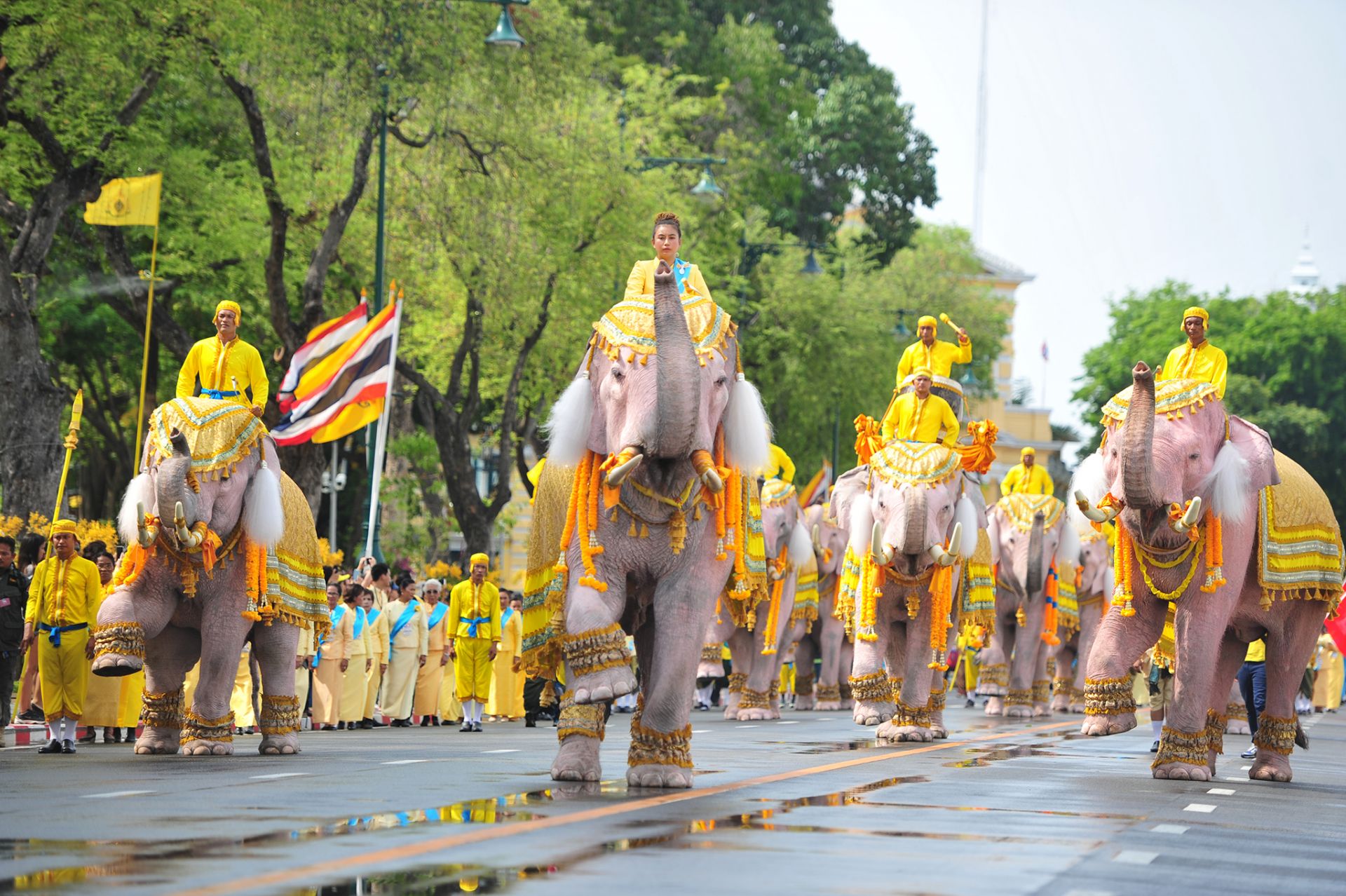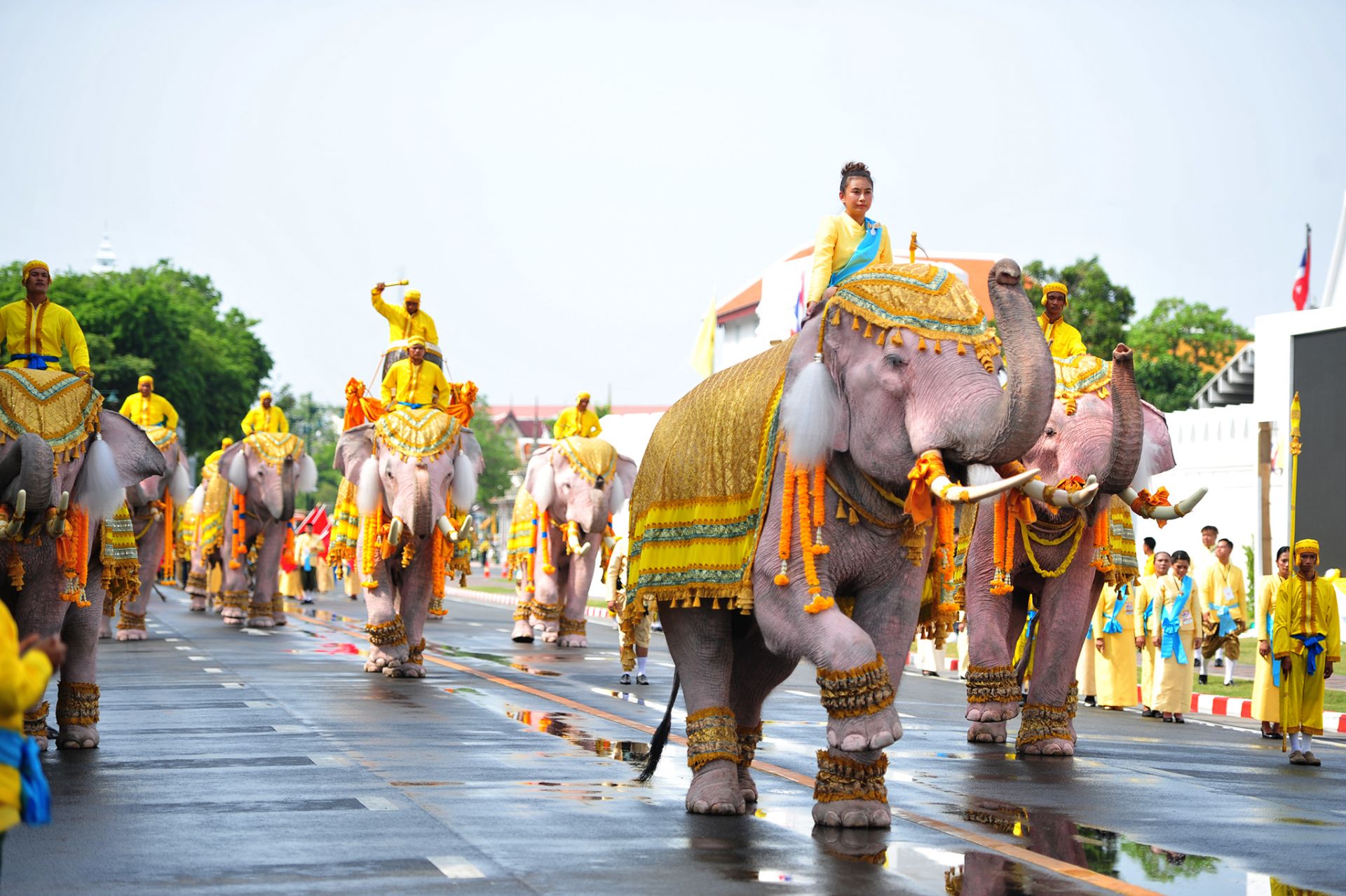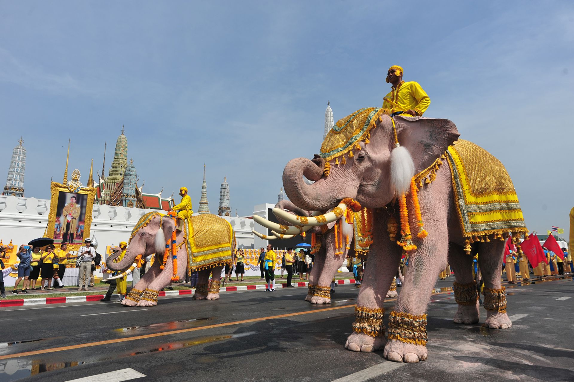 5月7日,在泰国曼谷,“白象”在驯象师的引领下前往大王宫。 当日,10头来自泰国大城府被染色的大象在驯象师的引领下来到曼谷大王宫附近向国王画像行跪拜礼,以表尊敬。 新华社发(拉亨 摄)