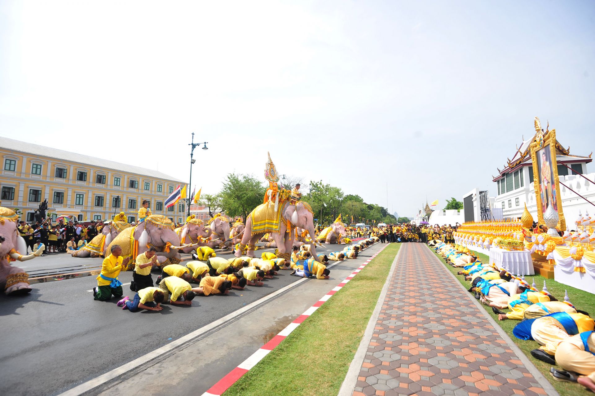 5月7日,在泰国曼谷,驯象师引领“白象”在大王宫前向国王画像行跪拜礼。新华社发(拉亨 摄)
